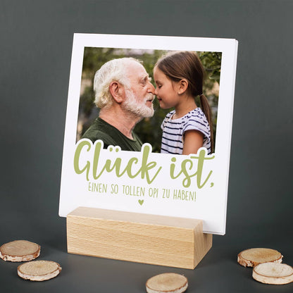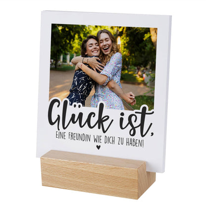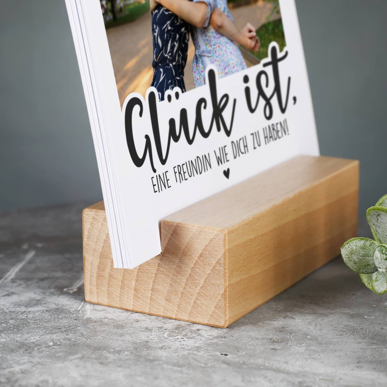 Entdecken Sie das ideale Fotogeschenk für jede Gelegenheit! Unser Fotoaufsteller mit einem robusten Holzfuß bietet Platz für insgesamt 13 Ihrer persönlich ausgewählten Fotos. Diese Gestaltungsmöglichkeit macht dieses Präsent zu einem ganz besonderen Fotogeschenk für Ihre Liebsten. Das Deckblatt wird mit der anregenden Aufschrift "Glück ist..." bedruckt und kann durch Ihren eigenen Text ergänzt werden. Jede weitere Seite des Aufstellers wird mit einer individuellen Zeile nach Ihrem Wunsch gestaltet. Das Ergebnis ist ein einmaliges, personalisiertes Geschenk, das dauerhafte Freude bereitet.