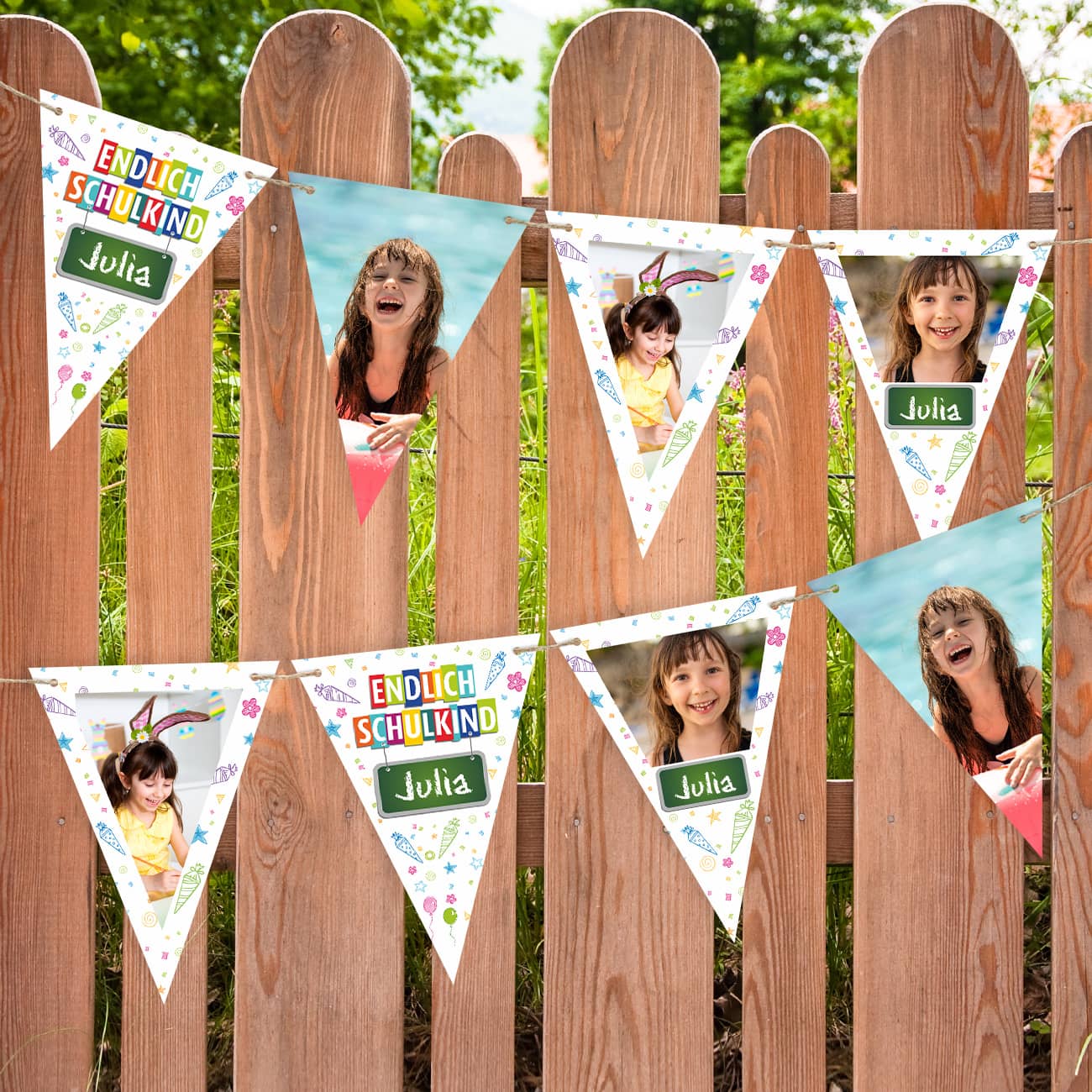 Endlich Schulkind! Mit dieser Girlande aus Fotowimpel wird die Einschulung zu einem unvergesslichen Ereignis. Jeder einzelne Wimpel dieser liebevoll gestalteten Girlande erzählt eine einzigartige Geschichte – die Geschichte Ihres kleinen Schulkindes. Um diesen wichtigen Meilenstein gebührend zu feiern, haben wir eine Girlande entworfen, die mehr ist als nur eine Dekoration zur Einschulung. Sie ist ein Fenster in die Vergangenheit, ein Rückblick auf all die kleinen und großen Momente, die diesen Tag zu etwas Besonderem machen. Sie wird nicht nur den Raum schmücken, sondern auch die Herzen der Gäste berühren, die diesen besonderen Tag gemeinsam mit Ihnen feiern.
