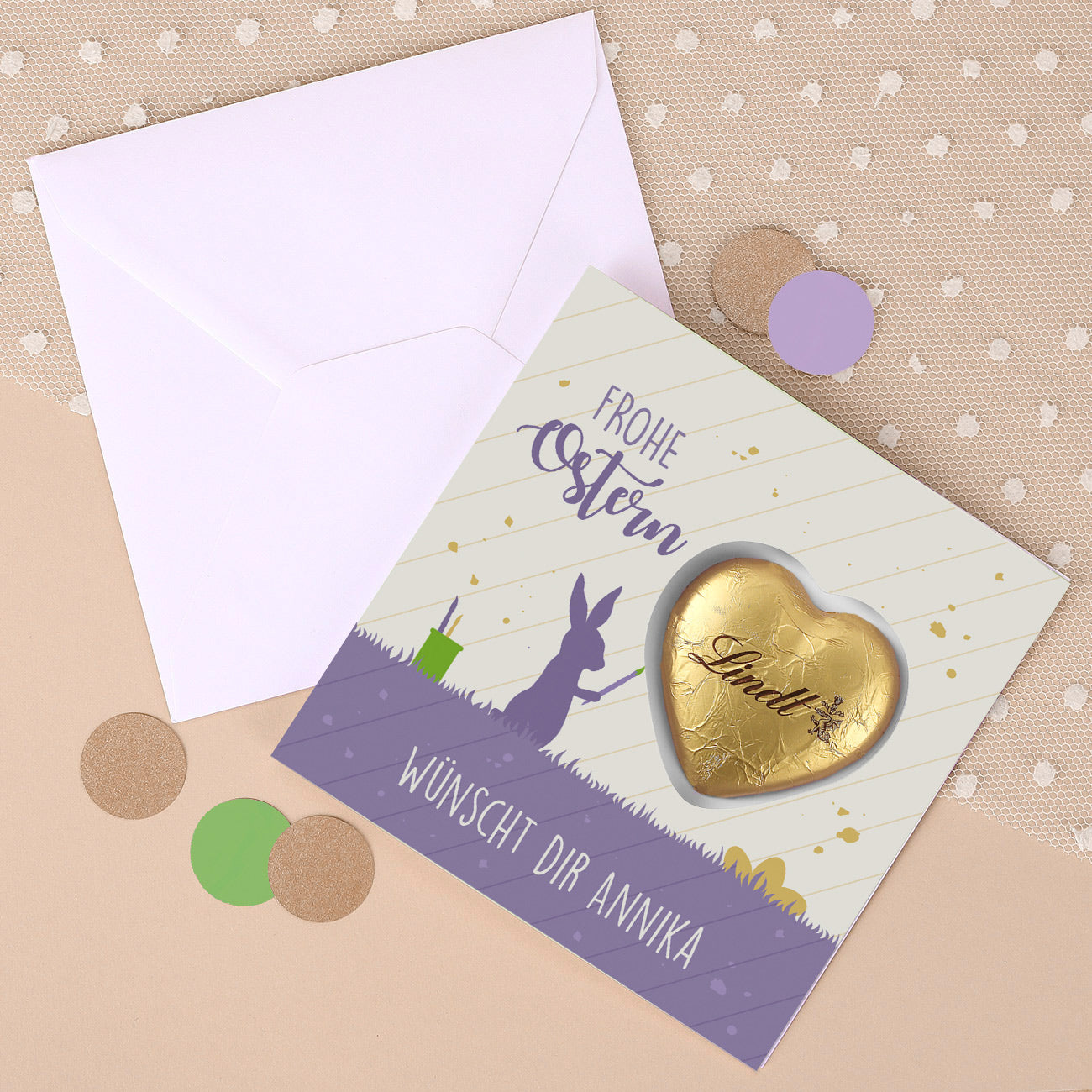 Klappkarte mit persönlichem Aufdruck zu Ostern und Lindt Schokoherz