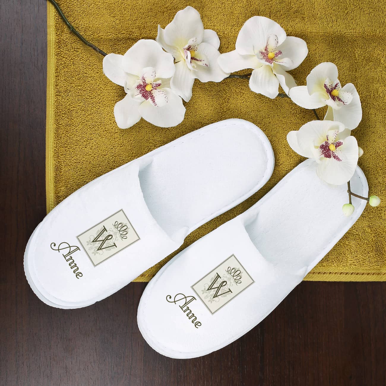Die weißen Frottee Slipper sehen elegant aus und werden persönlich mit Ihrem gewünschten Namen und einer Initiale bedruckt. Sie eignene sich hervorragend als Gästehausschuhe für Großeltern, Eltern oder große Kinder.