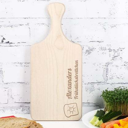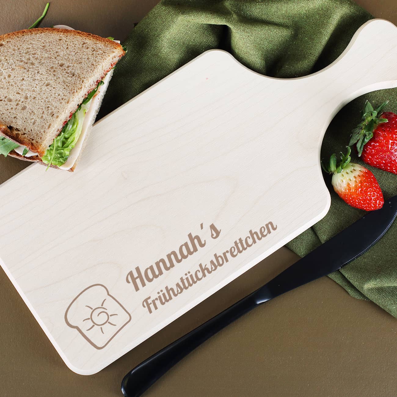 Genießen Sie Ihr Frühstück von diesem schönen Brettchen mit Griff aus Holz. Das Brett wird mit dem Wort Frühstücksbrettchen und einem Toastbrot mit einer Sonne drauf graviert. Außerdem wird es mit dem Vornamen des Beschenkten graviert.