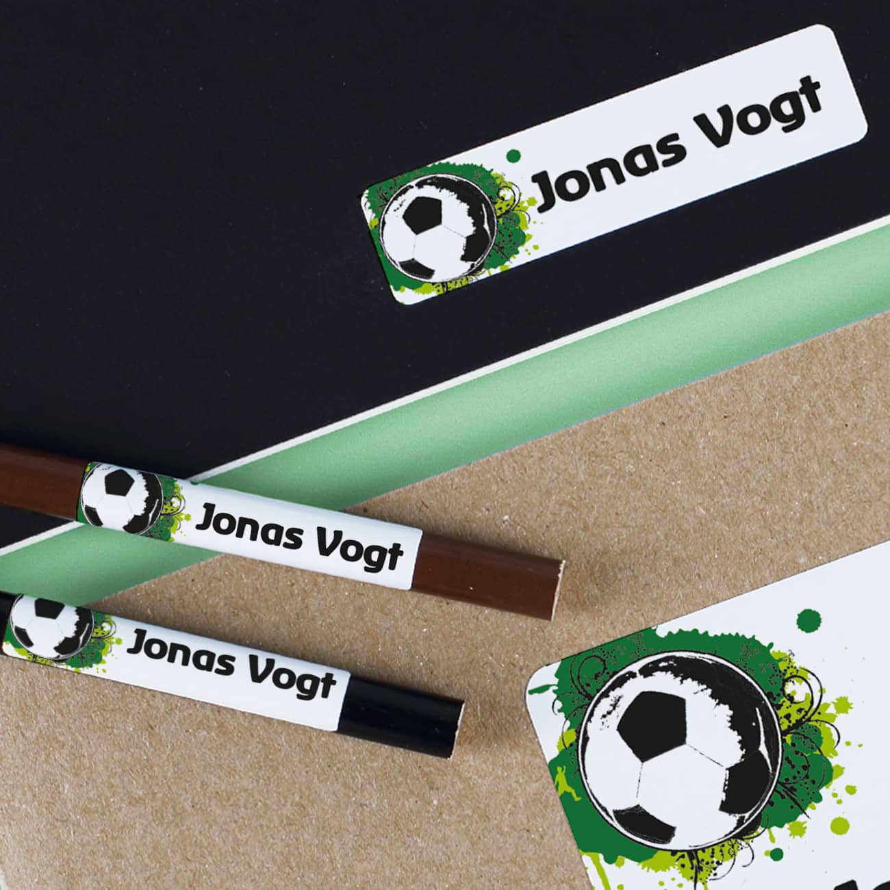 Auf diesem 100-teiligen Aufkleberset ist ein starkes Fußball Motiv im Grungelook zu sehen. Dazu wird der Name Ihres Kindes gedruckt. Die Namensaufkleber eignen sich für Schul- und Spielsachen und kleben auf vielen glatten und trockenen Untergründen. Sie können so mühelos und schnell persönliche Dinge für die Schule beschriften. Das starke Fußball-Motiv finden Kinder so cool, dass sie die Schuletiketten wirklich gern verwenden und sorgen somit dafür, dass nicht mehr so viel verloren geht.