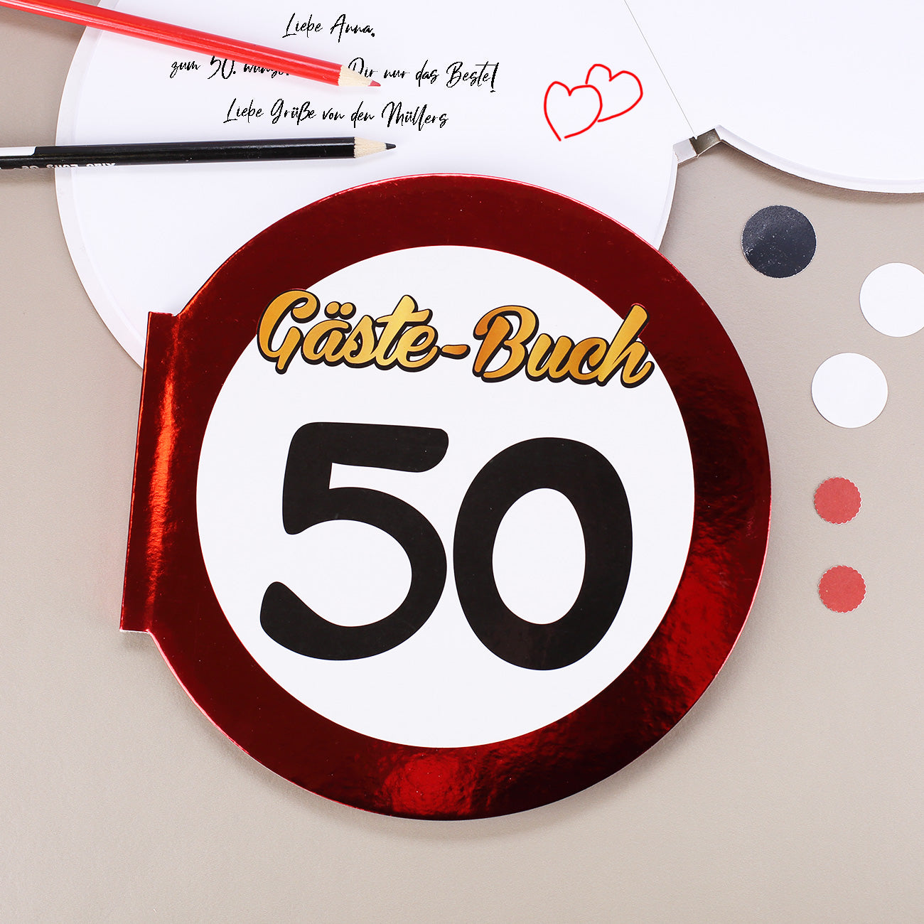 Wenn Sie für Ihren eigenen oder einen anderen 50. Geburtstag eine nette Dekoration benötigen, die für Gäste eine Beschäftigung ist, dann können wir Ihnen dieses Gästebuch nur empfehlen. Das Gästebuch mit Verkehrsschild Optik ist auch im Nachhinein für Sie eine schöne Erinnerung an den runden Geburtstag, da Gäste hier Ihre eigenen Gedanken und Worte verfassen können. Auch Zeichnungen können hier verewigt oder Fotos und Sticker eingeklebt werden. So kann man sich immer an diesen besonderen Geburtstag erinnern, schließlich ist die 50 ein halbes Jahrhundert! Verfasst werden kann alles zu einem 50. Geburtstag, auch witzige und schöne Momente über die Party. Mit solchen Dekorationen zum 50. Geburtstag wird eine Feier mit Familie und Freunden nie in Vergessenheit geraten.