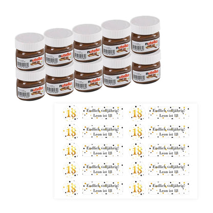 Das 10er Set Mini Nutella Gläser als Gastgeschenk wird mit den personalisierten Etiketten überzeugen, die zum Lieferumfang gehören und von Ihnen kinderleicht aufgeklebt werden. Sie erhalten 10 runde Aufkleber für den Deckel mit dem erreichten Alter in goldenen Zahlen und einem ansprechenden Gold-Konfetti-Motiv. Für die Gläser erhalten Sie 10 rechteckige Sticker mit zwei Zeilen Text nach Wunsch. Hier können Sie beispielsweise den Namen des Geburtstagskindes, Geburtstagswünsche und vieles mehr hinterlassen. Inspirationen können Sie sich gerne aus den Produktbildern entnehmen. Personalisierte Schokolade wird jeden Ehrentag noch mehr versüßen!