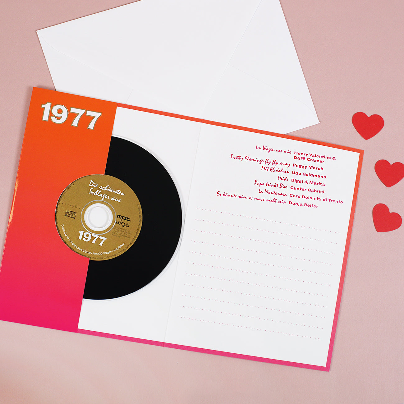 Die guten alten Schallplatten kennt ja sicher noch jeder! Das besondere an dieser Schallplatte ist, dass sie eigentlich gar keine ist. Es handelt sich natürlich um eine CD, der man einfach nur einen Schallplattenlook verpasst hat. Auf der CD befinden sich 7 Schlager aus dem Jahr 1977.