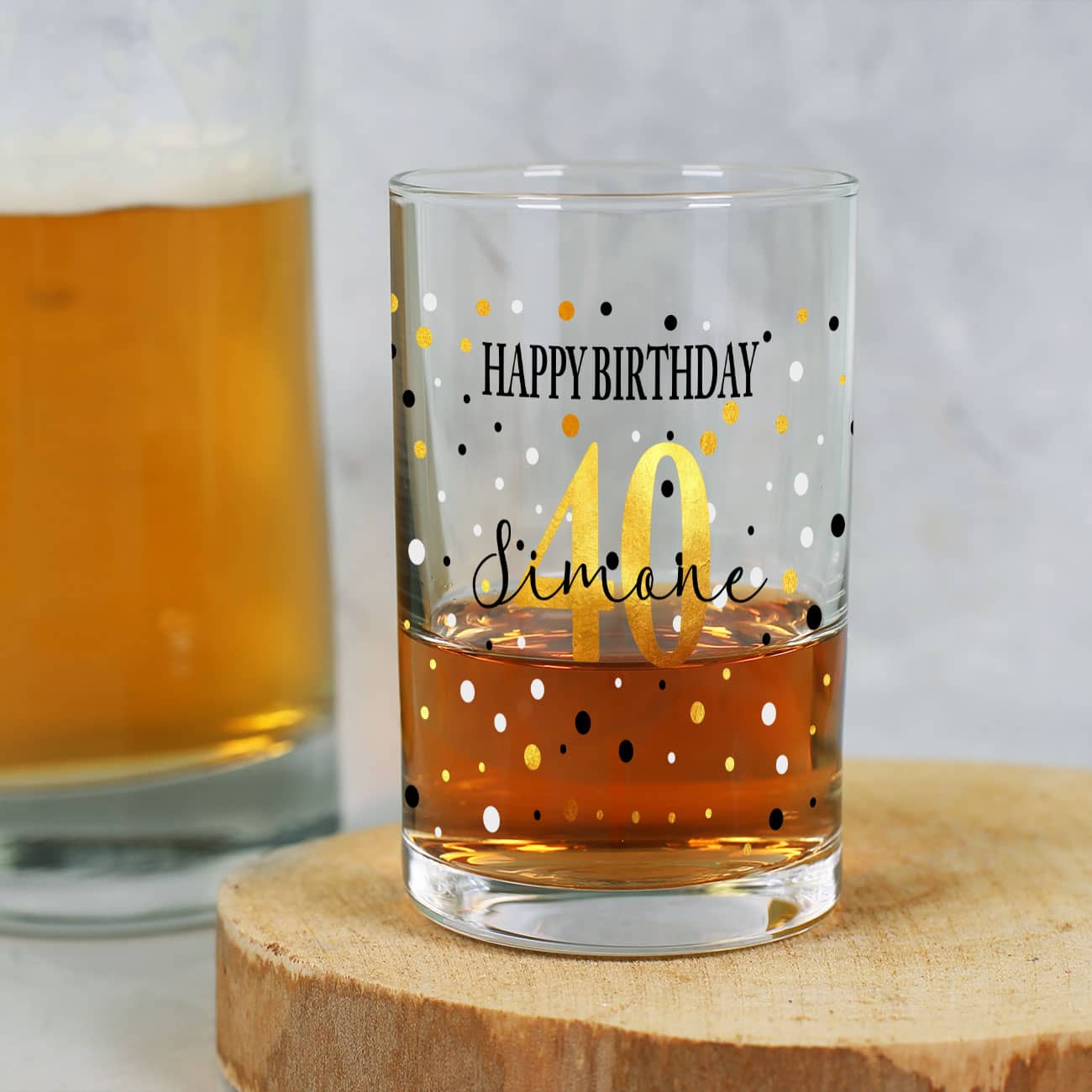 Möchten Sie einen bestimmten Geburtstag einfach unvergesslich machen, dann überraschen Sie das Geburtstagskind mit einem personalisierten Geschenk. Das Schnapsglas wird hier mit einem edlen Gold Konfetti Motiv, dem Schriftzug "Happy Birthday" und einer Personalisierung bedruckt. In großen goldenen Zahlen wird außerdem das Alter des Geburtstagskindes aufgedruckt. Ein Name in schwarzer geschwungener Schrift rundet dieses einmalige Design ab. Jedes mal, wenn das Geburtstagskind dieses stylische Schnapsglas aus dem Schrank nimmt, erinnert es sich an diese liebe Geste und die tolle Feier! Ein einmaliges Geburtstagsgeschenk, das nun zur ersten Wahl zum Anstoßen wird!