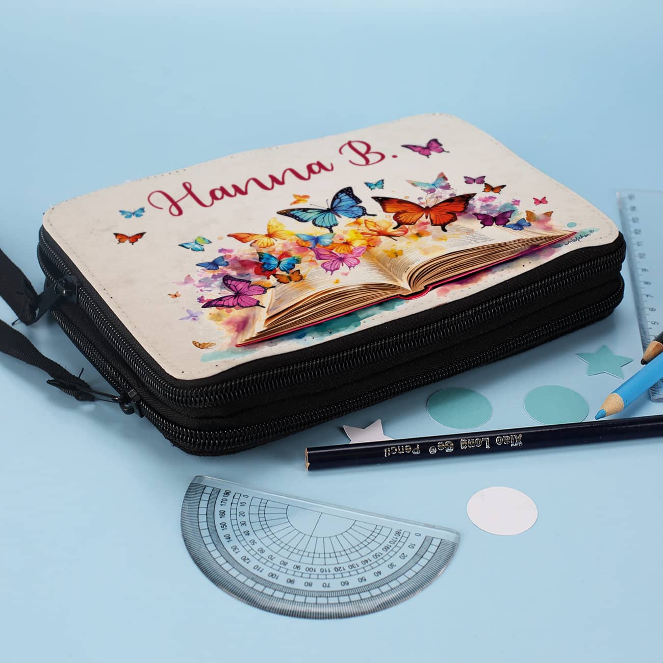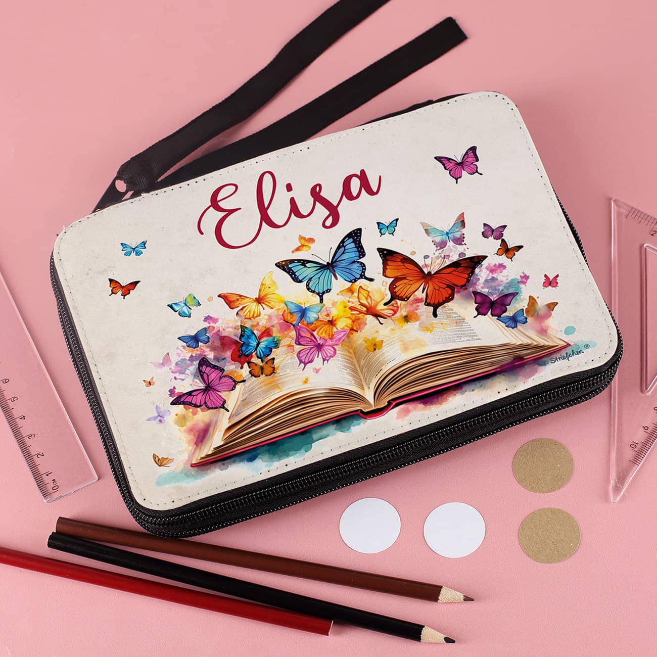 Gefüllte Federmappe mit Watercolor-Buch und Schmetterlingsmotiv bedruckt