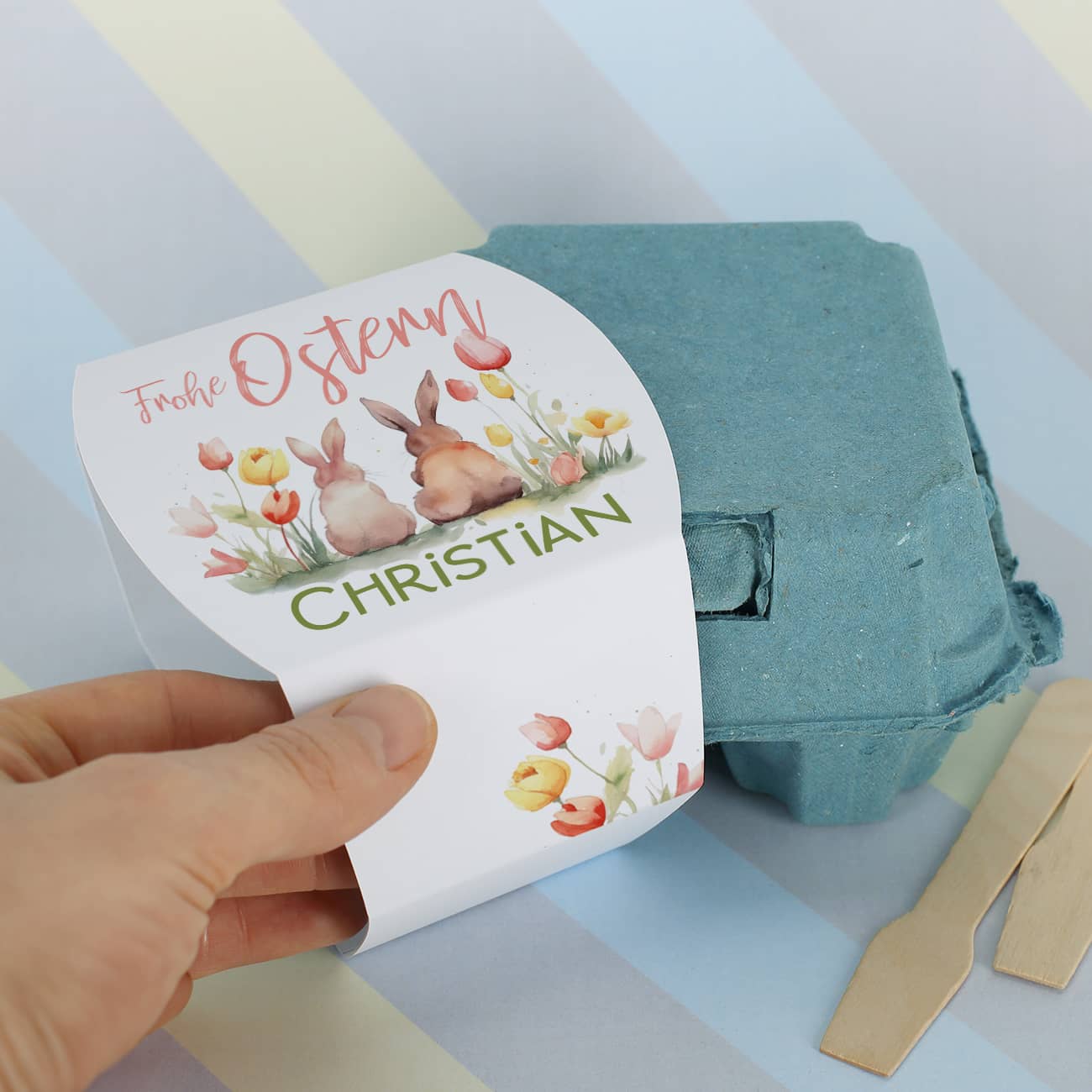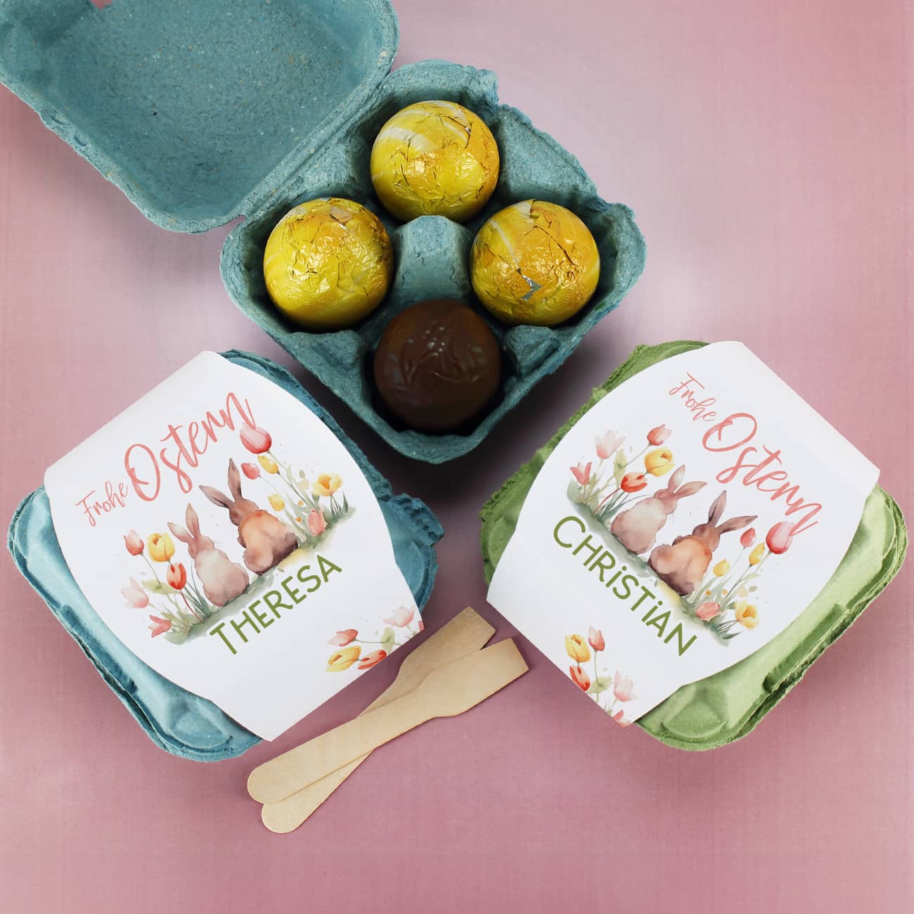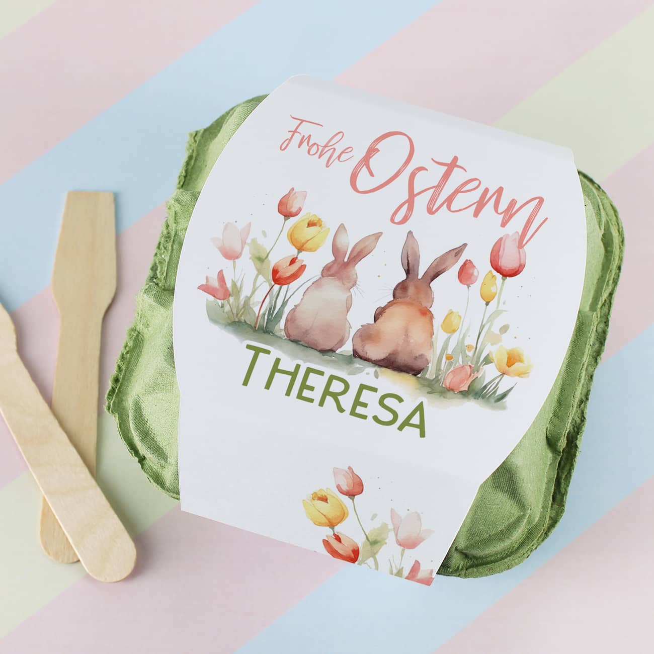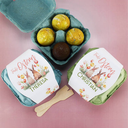 Überraschen Sie Ihre Liebsten zu Ostern mit einer köstlichen und persönlichen Geste! Unsere gefüllten Schokoeier im persönlich gestalteten Eierkarton sind das perfekte Ostergeschenk, um Freude zu verbreiten. Die Banderole des Eierkartons ist mit einem zauberhaften Hasen-Motiv im Aquarell-Stil gestaltet, wobei die Hasen inmitten einer wunderschönen Blumenwiese sitzen. Das Motiv wird durch die Aufschrift "Frohe Ostern" ergänzt, die mit einem Namen Ihrer Wahl personalisiert werden kann, um einen persönlichen und leckeren Ostergruß zu übermitteln.