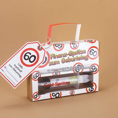 Diese Finanz-Spritze ist das perfekte Geldgeschenk zum 60. Geburtstag! Eine kleine Geldspritze kann bekanntlich jeder gebrauchen, da kommt dieser Impfstoff genau richtig. Die Impfdosis ist in einer Kunststoffspritze sicher verstaut. Die Spritze wird in einem hübschen Koffer als Geschenkverpackung verschenkt, dieser ist bedruckt mit auffälligen Verkehrszeichen mit der Zahl 60.