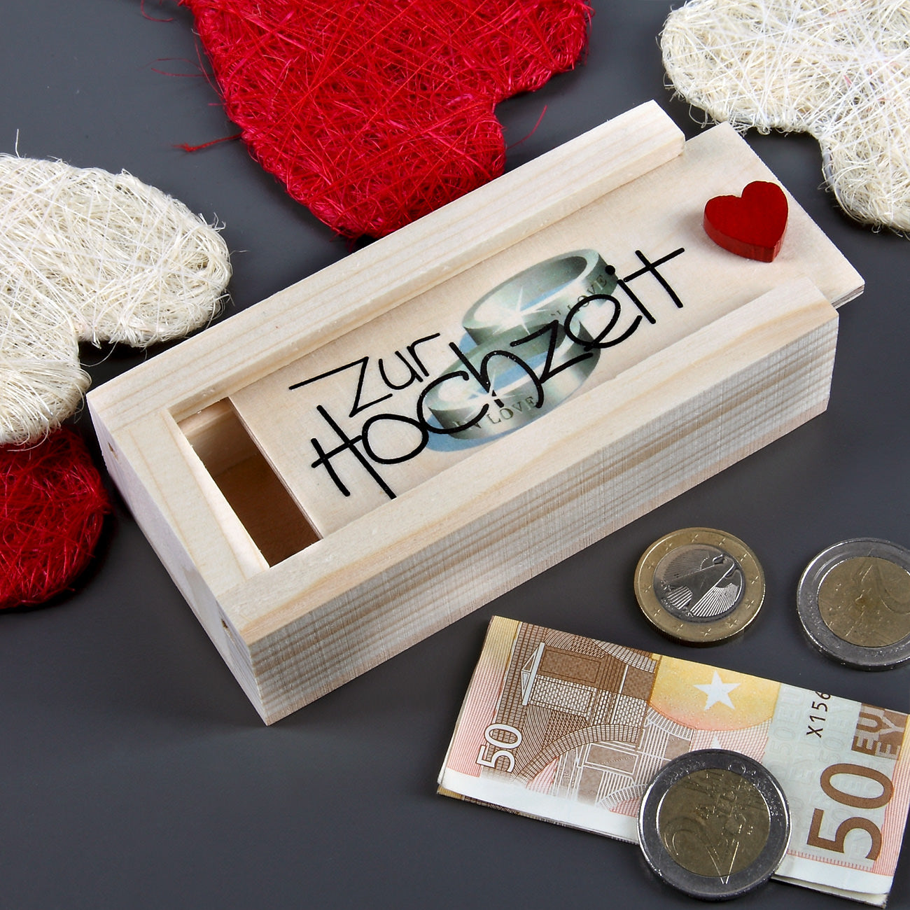 Das ist doch mal eine schöne Idee, um zur Hochzeit Geld zu verschenken. Einfach in die Kiste packen und Deckel zuschieben. Die Kiste ist aus Holz und hat eine Größe von 12 x 5,5cm. Auf dem Deckel ist ein kleines Herz angebracht neben dem *Zur Hochzeit* steht.