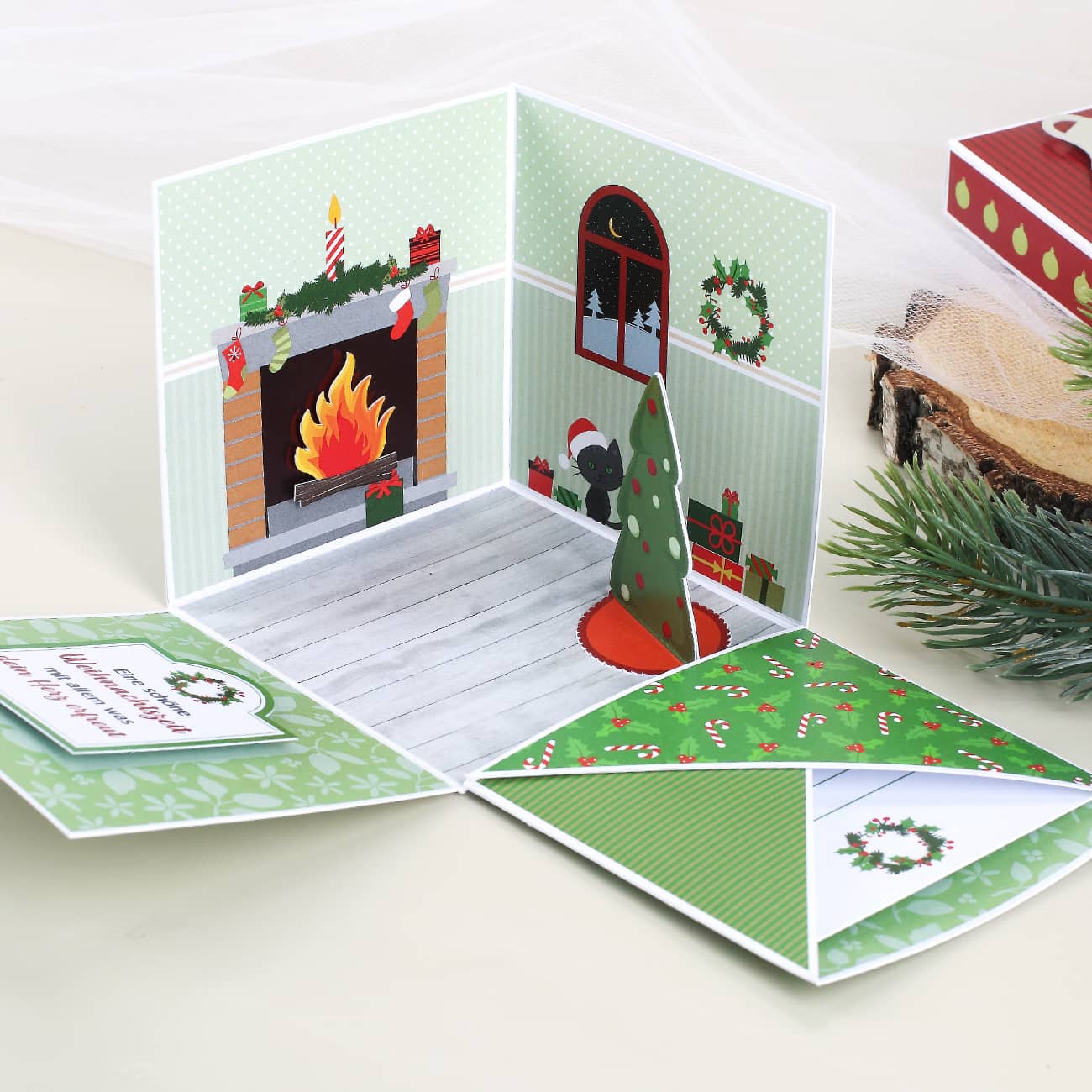 Nach dem Abnehmen des Deckels klappen die Wände auf und präsentieren die Innenseite der liebevoll gestalteten Box. Ein festlich eingerichtetes Kaminzimmer mit Weihnachtsbaum kommt jetzt zum Vorschein. Auf einer Innenwand befindet sich eine Lasche mit Karte auf der Sie Ihren Gruß oder Wunschtext hinterlassen können. Die Lasche ist so groß, dass man dort auch eine Gutscheinkarte im EC-Format sowie Geldscheine verstauen kann.