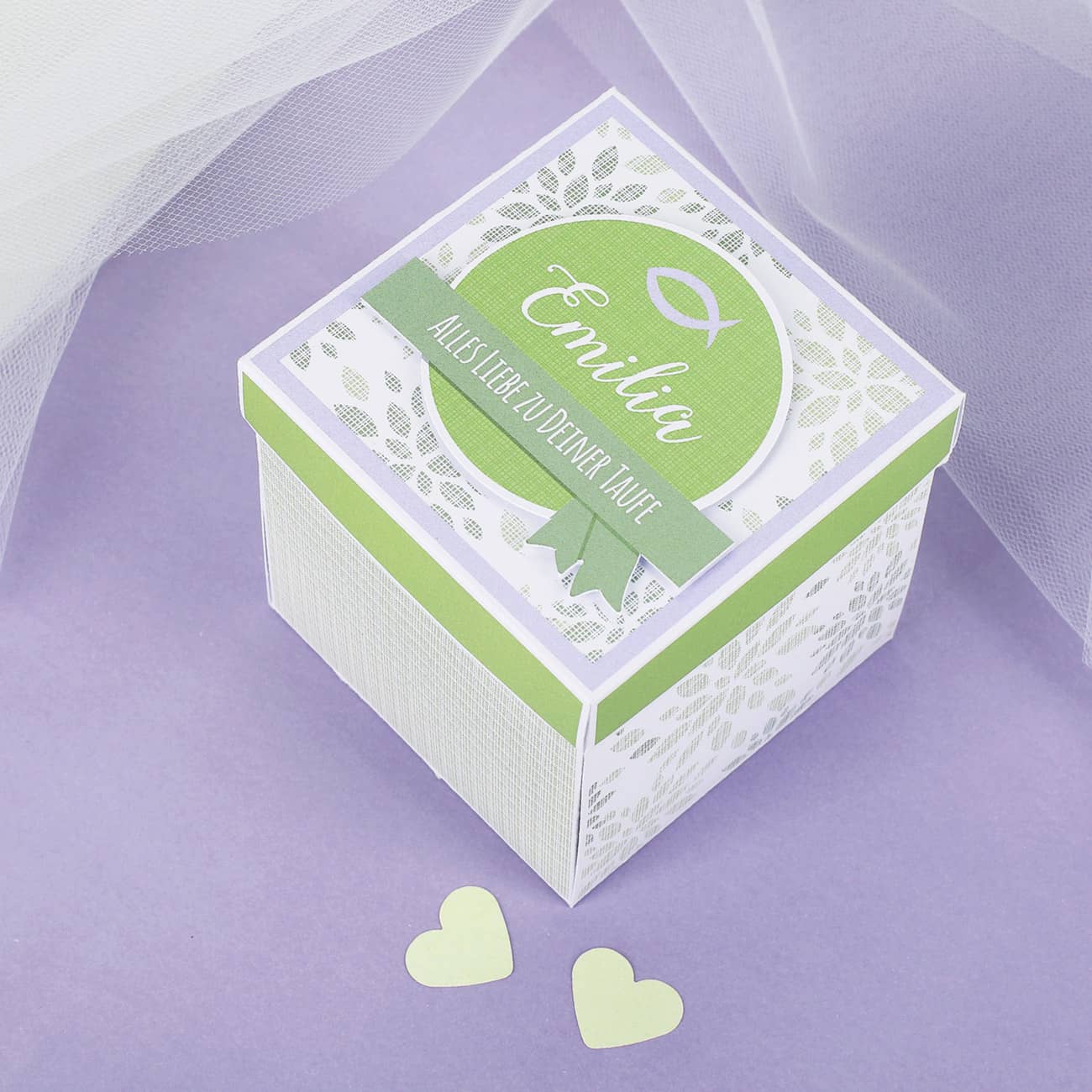 Geschenkbox zur Taufe, Kommunion oder Konfirmation mit Name und Wunschtext