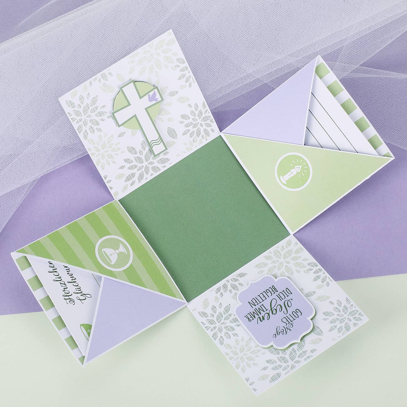 Auf dem Deckel der Box haben sie die Möglichkeit ihren Wunschtext und den Namen des Kindes einzutragen. Das besondere der Überraschungsbox beginnt aber erst, wenn der Deckel abgenommen wird. Dann fallen die Wände der Box zur Seite und ihr Blick wird auf den wunderschönen Innenteil gelenkt. Dort befindet sich neben den religiösen Motiven auch der Spruch - Möge Gottes Segen dich immer begleiten. Auf zwei eingeschobenen Karten haben Sie die Möglichkeit Ihre selbst verfassten Glück- und Segenswünsche zu hinterlassen.