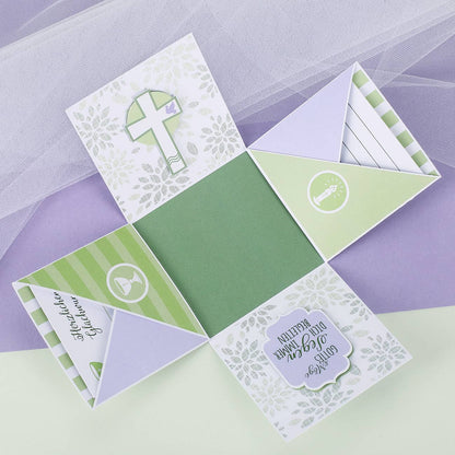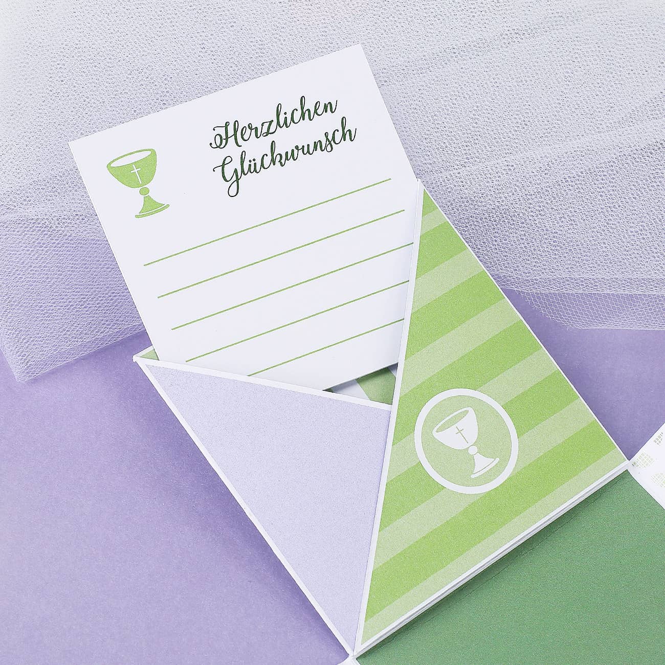 Gratulieren Sie zur Taufe, Kommunion oder Konfirmation mit dieser bezaubernden Geschenkbox. Sie dient als Verpackung für Geld, Gutscheine oder andere kleine Geschenke wie Schutzengel oder Schmuck.