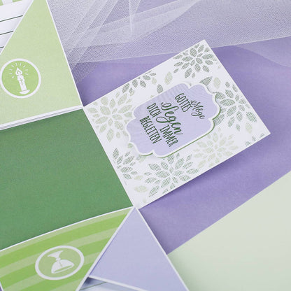 Handgefertigte Überraschungsbox mit religiösen Motiven in grün und lila