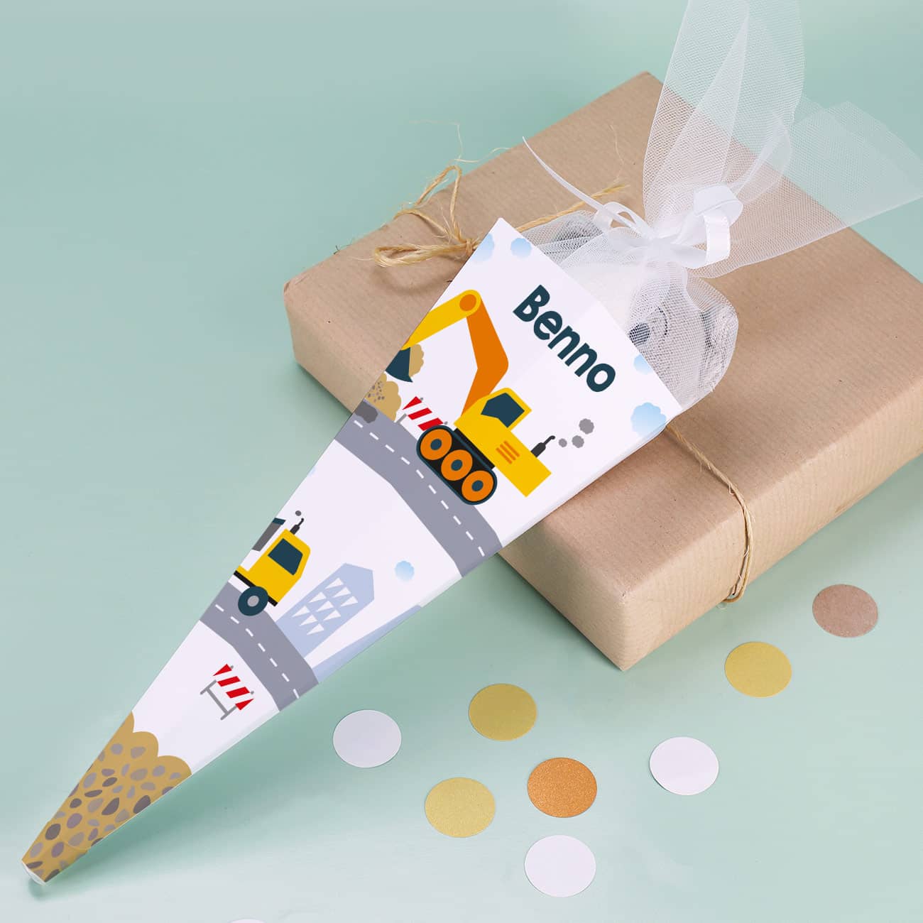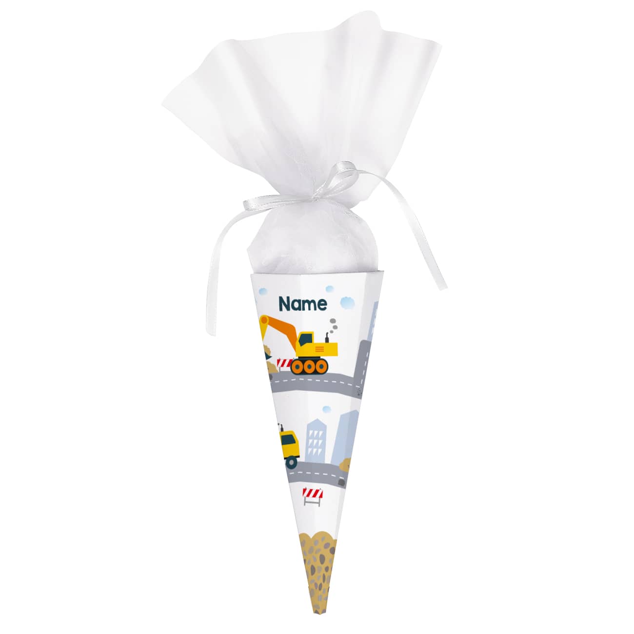 Die Geschwistertüte wird daher mit einer tollen Baustellen – Szenerie bedruckt. Dort fährt der Muldenkipper die nächste Ladung Erde zum Ablageplatz, während der Bagger fleißig am Graben ist. Zur Absicherung der Baustelle lassen sich überall auf der Zuckertüte Absperrungen erkennen. Am Himmel sind vereinzelt einige Wolken zu sehen und an den Straßen stehen mächtige Hochhäuser. Ein echter Blickfang wird die kleine Geschwistertüte durch den Aufdruck Ihres Wunschnamens, welche nach Ihren Vorgaben auf der kleinen Schultüte abgebildet wird.