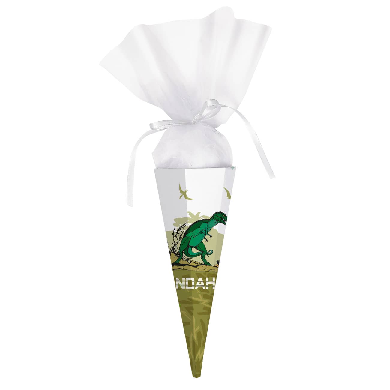 Damit es etwas ganz besonderes bleibt, steht Ihr Wunschname mit dabei, somit ist es ganz persönlich. Bedruckt ist die Zuckertüte mit einem großen Dinosaurier, der durch seine freie Wildbahn läuft. Um ihn herum fliegen noch weitere Flugsaurier. Gerne können Sie auch unsere Vorschau Funktion nutzen, um zu sehen, wie Ihr Name auf der Schultüte aussieht.
