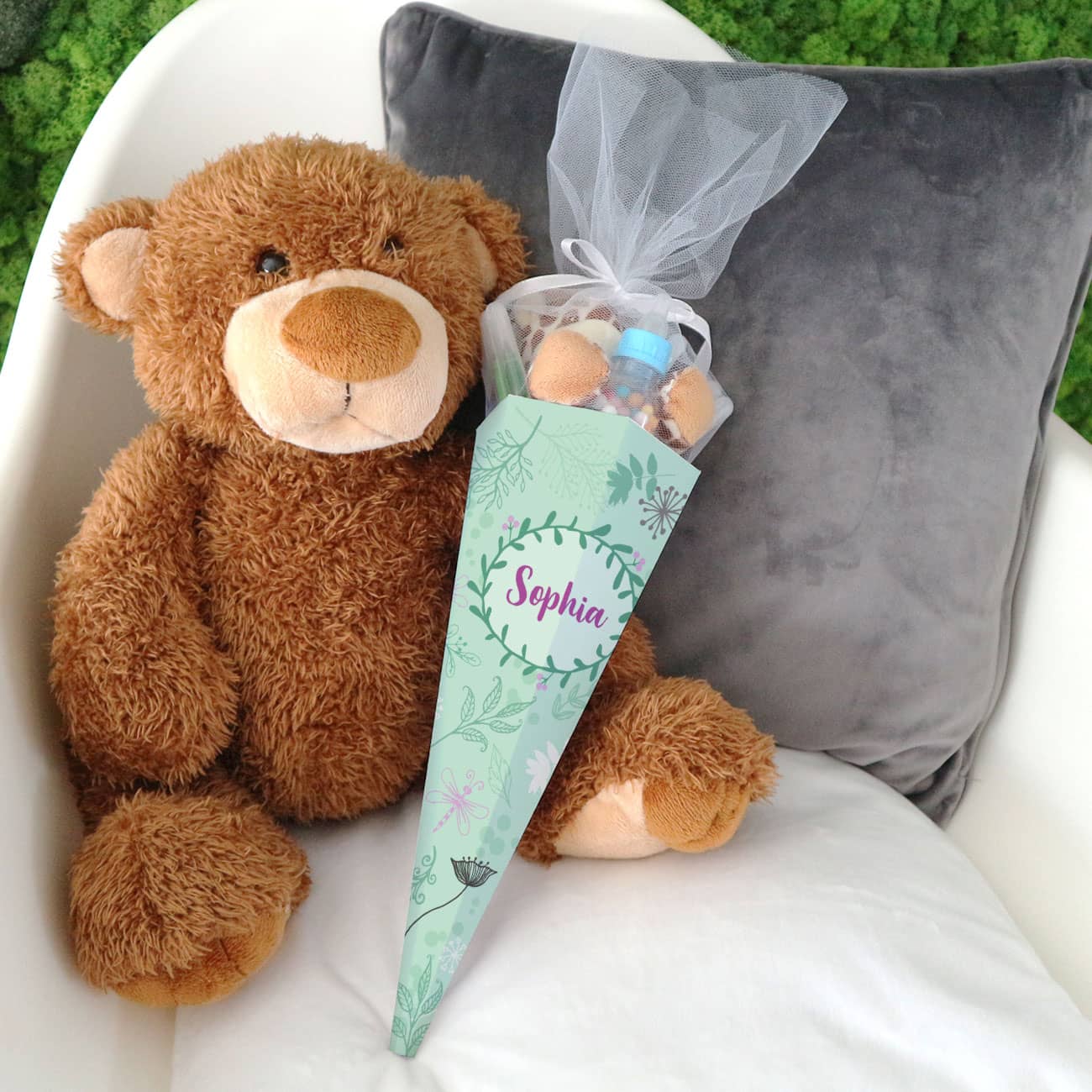 Bedruckt wird die kleine Schultüte mit einer Vielzahl von grünen Ranken und Blättern. Dazwischen befinden sich einige Blumen und Blüten, welche sich mit einem anderen Farbton dezent vom Untergrund abheben. Dabei stechen besonders die pinken Blüten und gleichfarbigen Libellen hervor. Dieser auffallende Farbtupfer sieht auf der leicht anmutenden Schultüte sehr schön aus. In einem Kreis aus Ranken und rosa Knospen wird Ihr Wunschname nach Ihren Vorgaben auf der kleinen Geschwistertüte abgebildet. Gerne können Sie auch unsere Vorschau nutzen, um sich vorab einen Eindruck von der fertigen Zuckertüte zu verschaffen.