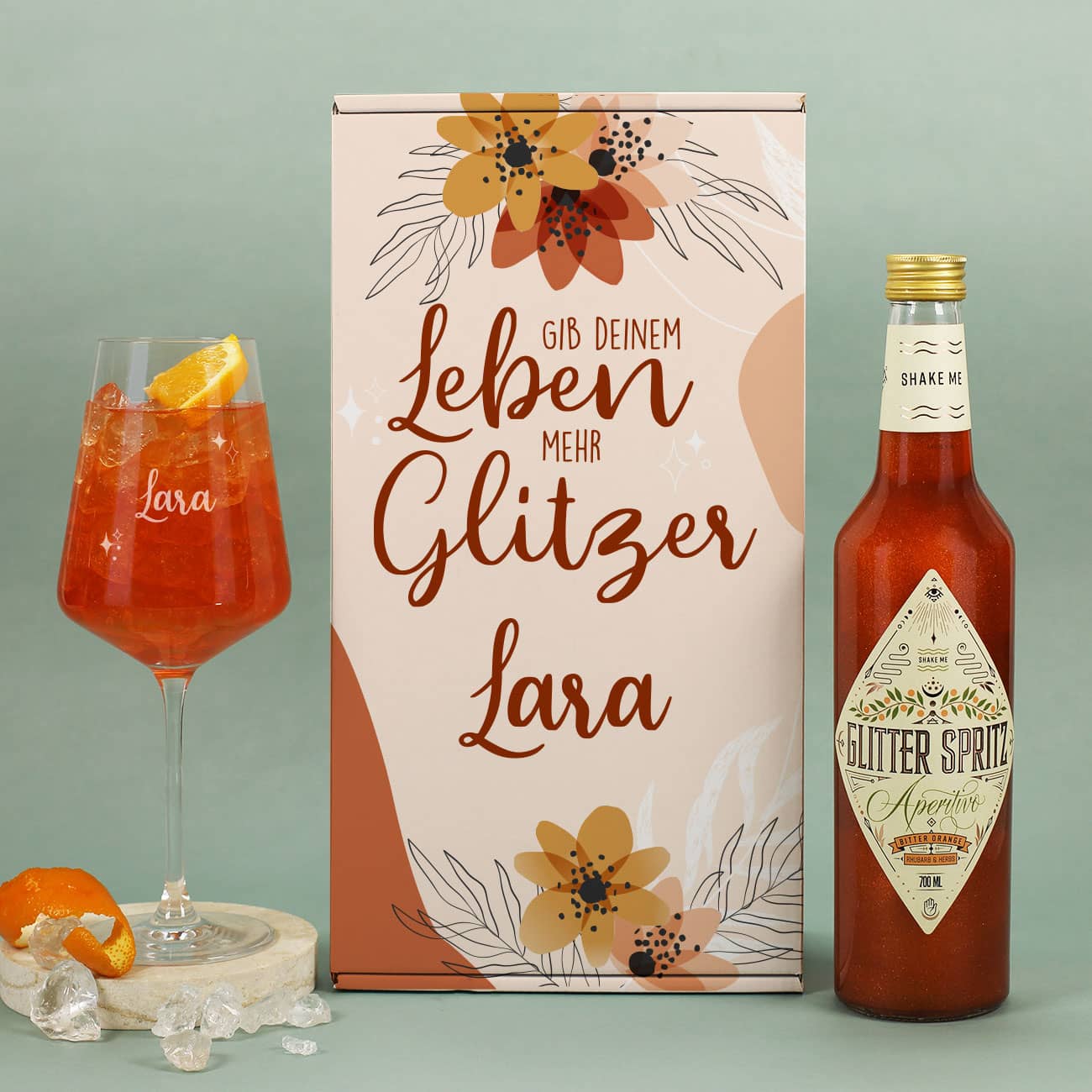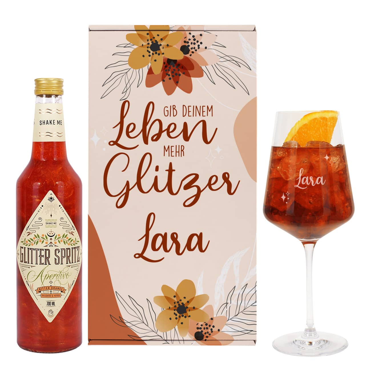 Die personalisierte Geschenkverpackung macht dieses Geschenkset zu einer besonderen Aufmerksamkeit für Frauen zum Geburtstag und anderen Anlässen. Mit hochwertigen Materialien und einer liebevollen Gestaltung ist es eine einzigartige Möglichkeit, Ihre Wertschätzung auszudrücken. Im Inneren der Geschenkverpackung finden Sie eine Flasche des spritzigen Glitter Spritz Aperitivo. Das gravierte Weinglas von Leonardo aus einem Glas in Teqton-Qualität hergestellt ermöglicht eine einfache Reinigung in der Spülmaschine. Das Glas kann direkt mit dem Glitter Spritz eingeweiht werden!