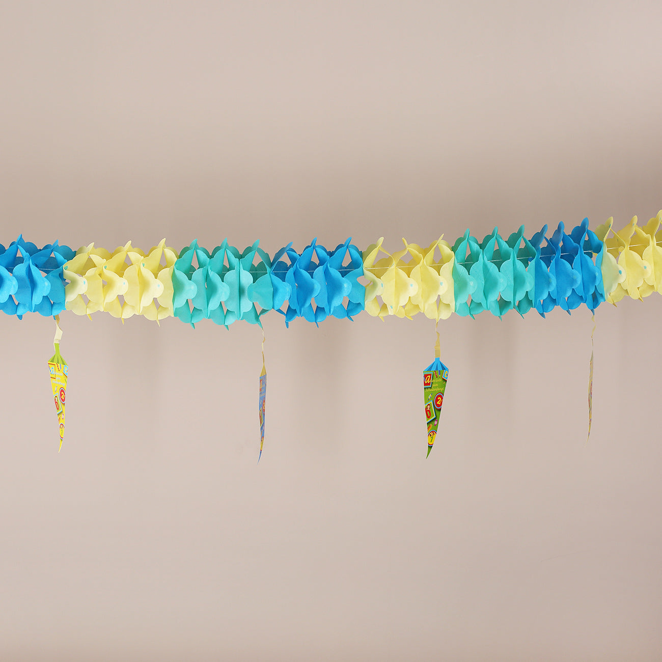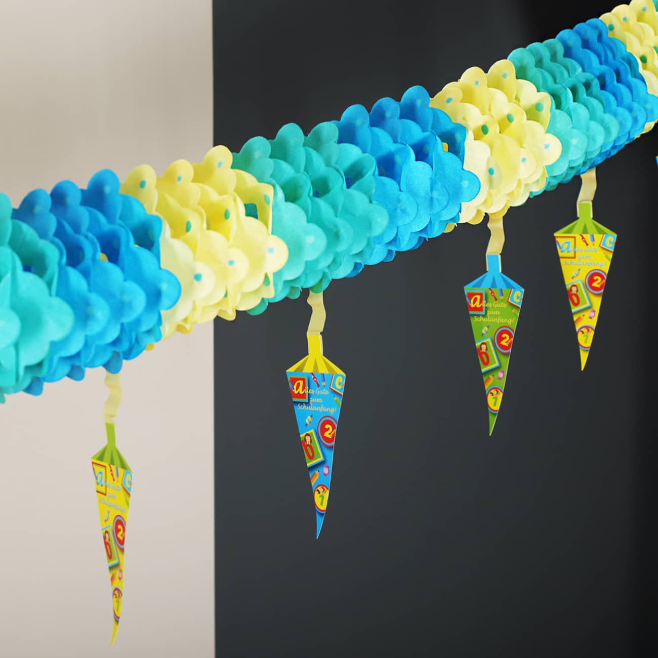 Die bunte Girlande hat eine Länge von 4 Meter und besteht aus Papier und hat insgesamt 12 Dekoanhänger in Form einer Schultüte. Dekorieren Sie mit dieser auffälligen Party-Girlande Ihre Location für die Schuleinführungsfeier und machen sie Ihrem Schulkind eine Freude.