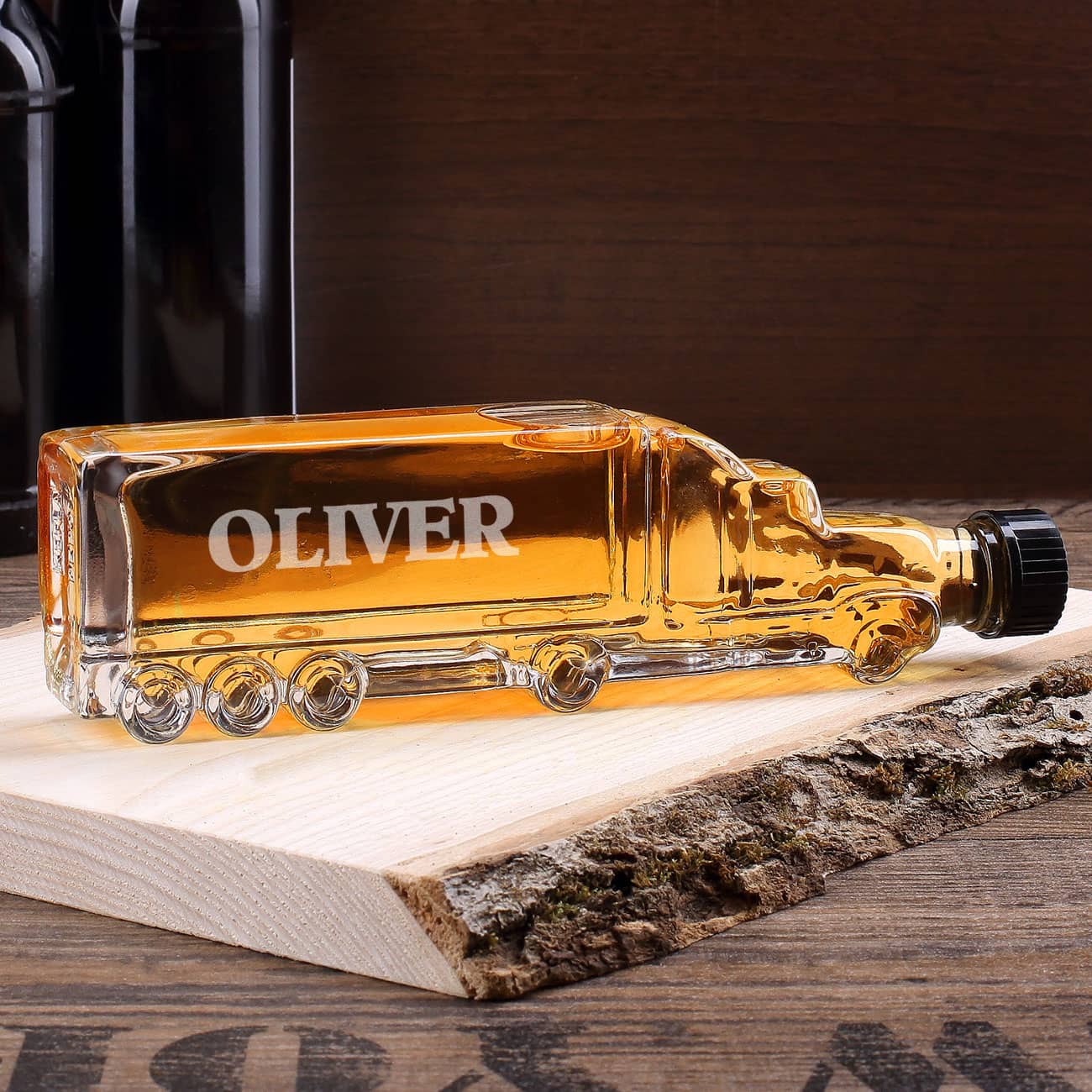 Die Flasche besteht aus stabilem Klarglas und ist wie ein Truck geformt. Vorn wird die Flasche mit einem schwarzen Schraubverschlussdeckel verschlossen. Eine Seite des Trucks wird mit Ihrem Wunschnamen graviert.