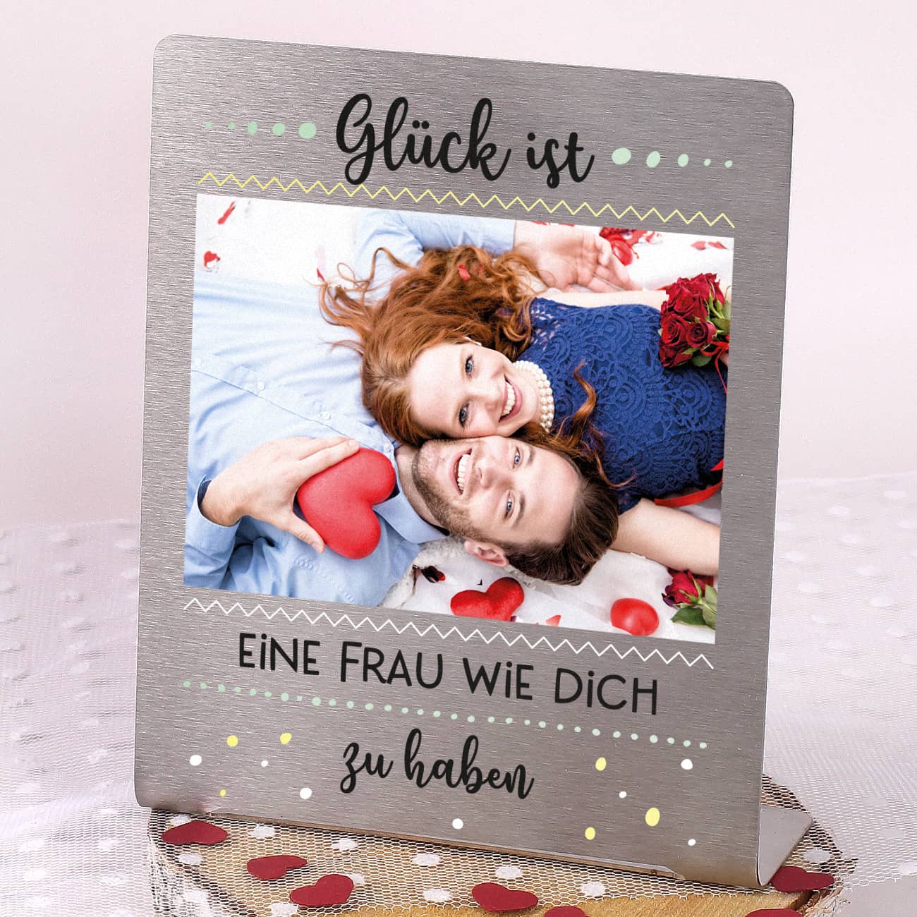 Hergestellt aus gebürstetem Edelstahl wird der Aufsteller mit Ihrem Foto und Wunschtext persönlich gestaltet. Unter der Zeile "Glück ist" folgt Ihr gewünschtes Foto im Format 11,5 x 8 cm. In die darauf folgende Zeile schreiben Sie Ihren gewünschten Text. Abschließend folgen die Worte "zu haben". Und fertig ist ein wunderbares Geschenk für einen Menschen, der Ihnen sehr am Herzen liegt.