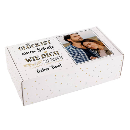 Zeigen Sie Ihre Liebe mit einem persönlichen Touch! Unsere individuell bedruckte Geschenkbox mit Ihrem Foto ist die perfekte Art, Ihren Liebsten zu zeigen, wie besonders sie sind. Personalisieren Sie sie mit einem Foto Ihrer Wahl, das schöne Erinnerungen festhält, und ergänzen Sie ihn mit einem einzigartigen Spruch oder Text Ihrer Wahl. Der Spruch "Glück ist ... wie dich zu haben." wird mit zwei Zeilen Text nach Wunsch ergänzt, so dass die Geschenkverpackung für jeden passend gemacht werden kann. Ob zum Valentinstag für Ihren Schatz, Muttertag, Vatertag, Geburtstag der besten Freundin oder anderen Anlässen, diese Geschenkbox mit liebevoller Botschaft ist perfekt, um Ihre Zuneigung und Wertschätzung zu zeigen.