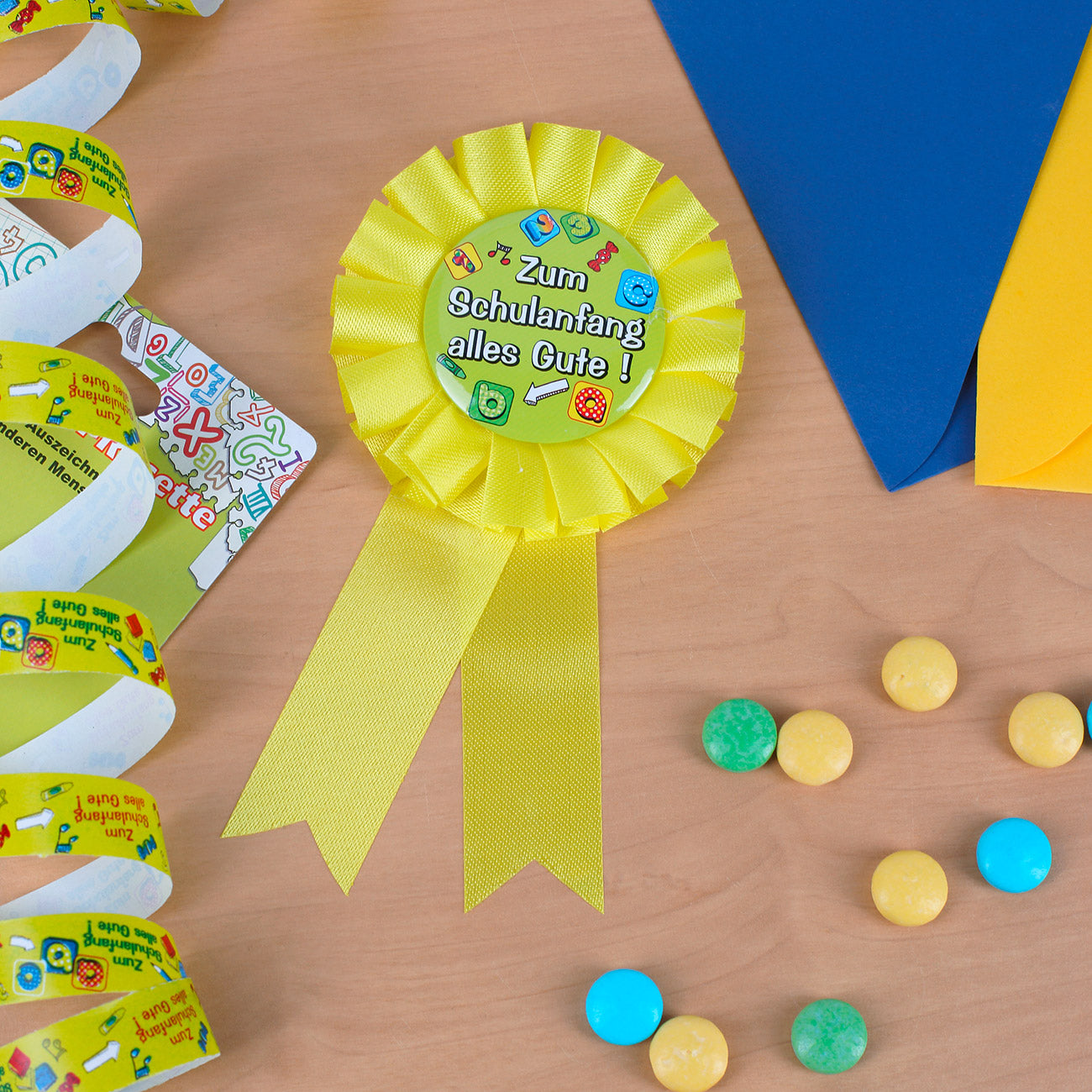 Die Glückwunsch-Rosette ist mit einer Schleife und einen bunten Button verziert auf dem der Spruch "Zum Schulanfang alles Gute!" steht.