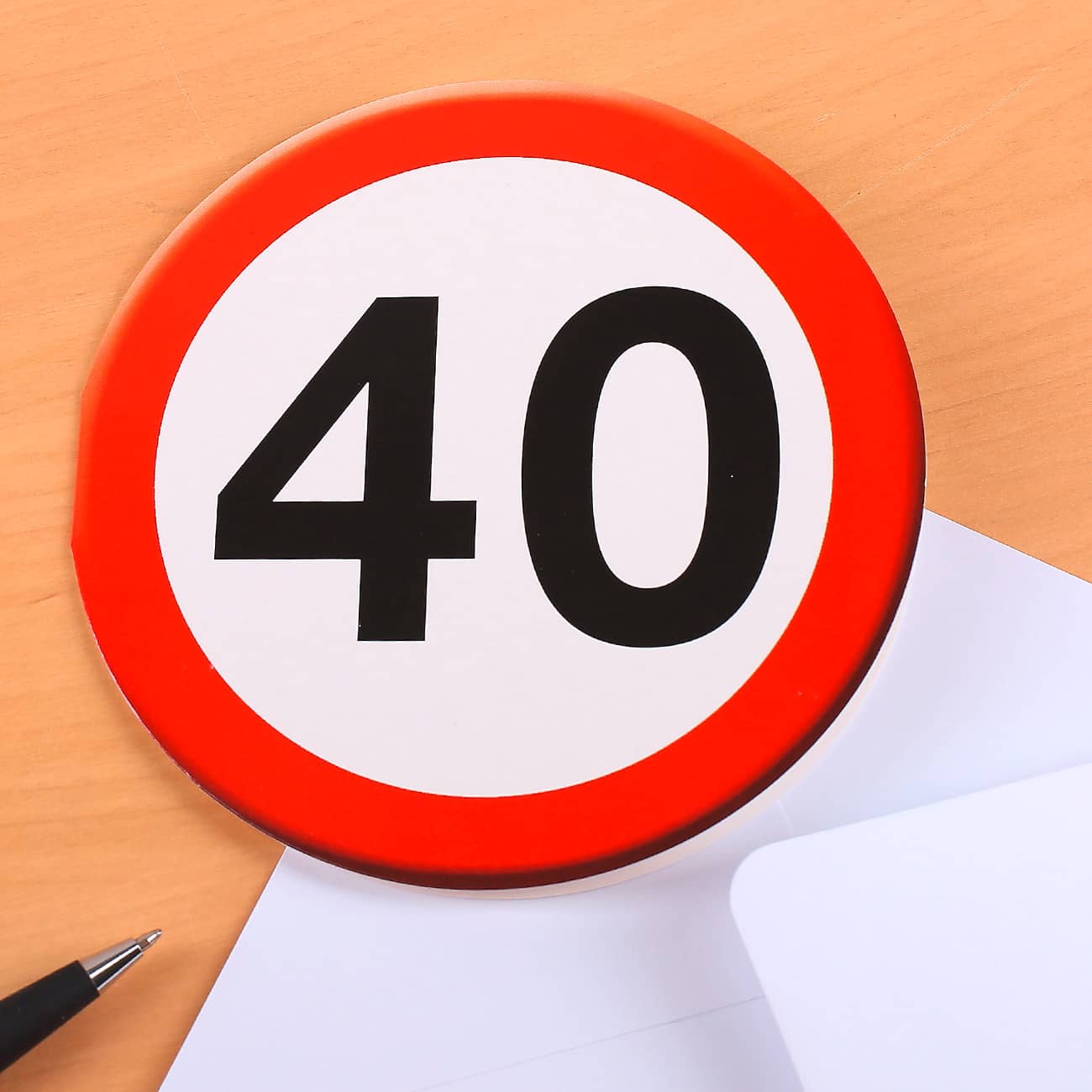 Diese ausgefallene Karte zum 40. Geburtstag kommt bei dem Jubilar oder der Jubilarin bestimmt gut an. Sie hat die runde Form eines Verkehrszeichens mit rotem Rand und in der Mitte steht die Zahl 40 in schwarz. Verschenken Sie die Glückwunschkarte mit passendem Umschlag in weiß und schreiben Sie ein paar liebe Worte und Geburtstagsgrüße in die beiden Innenseiten. Die besondere Verkehrszeichen Form der Grußkarte fällt direkt ins Auge.