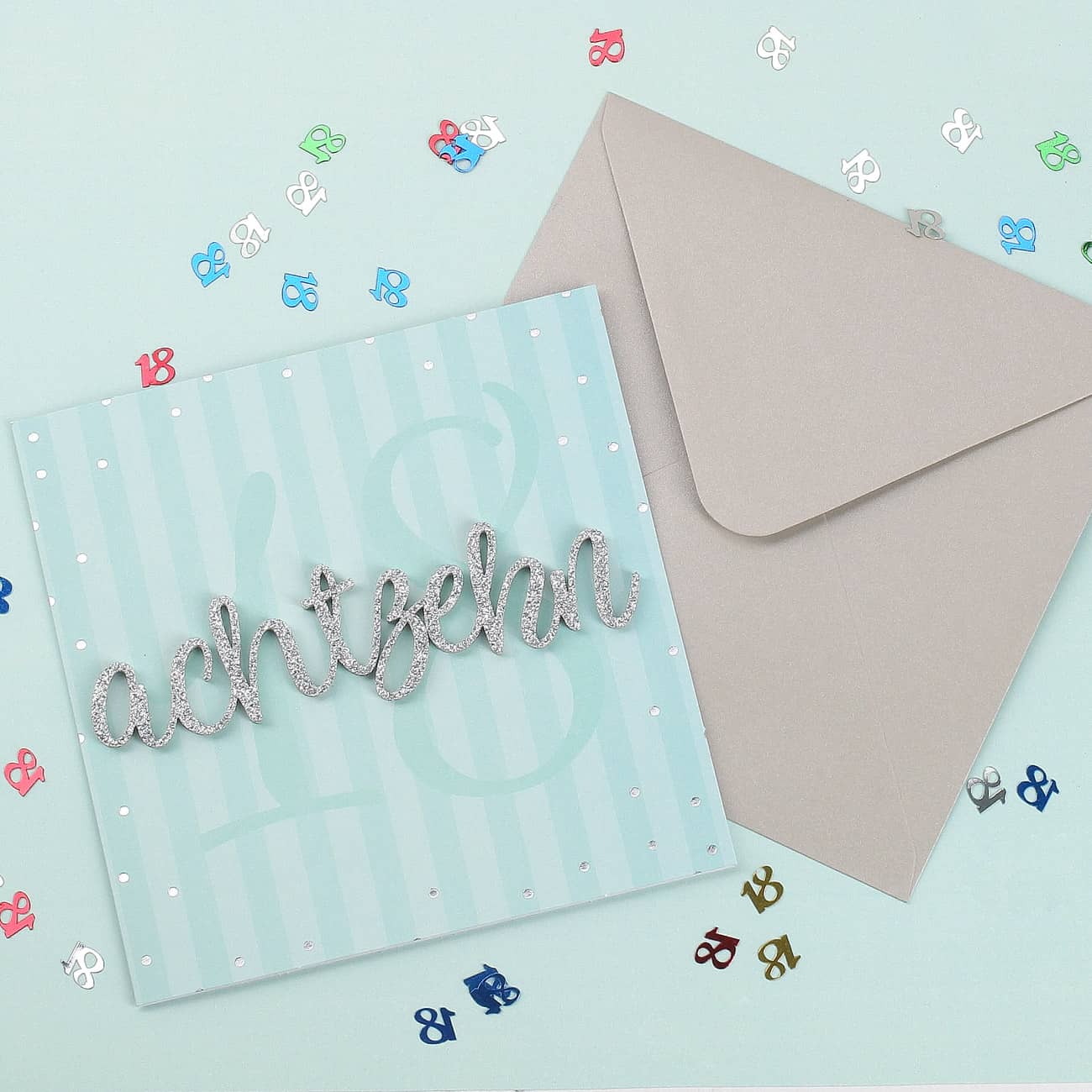 Endlich 18 – endlich volljährig! Zum 18. Geburtstag bereitet diese edle Geburtstagskarte eine Freude: vor dem mintfarbig gestreiften Hintergrund ragt ein silbern-glitzernder 3D-Schriftzug hervor: „achtzehn“ steht dort in geschwungenen Lettern.
