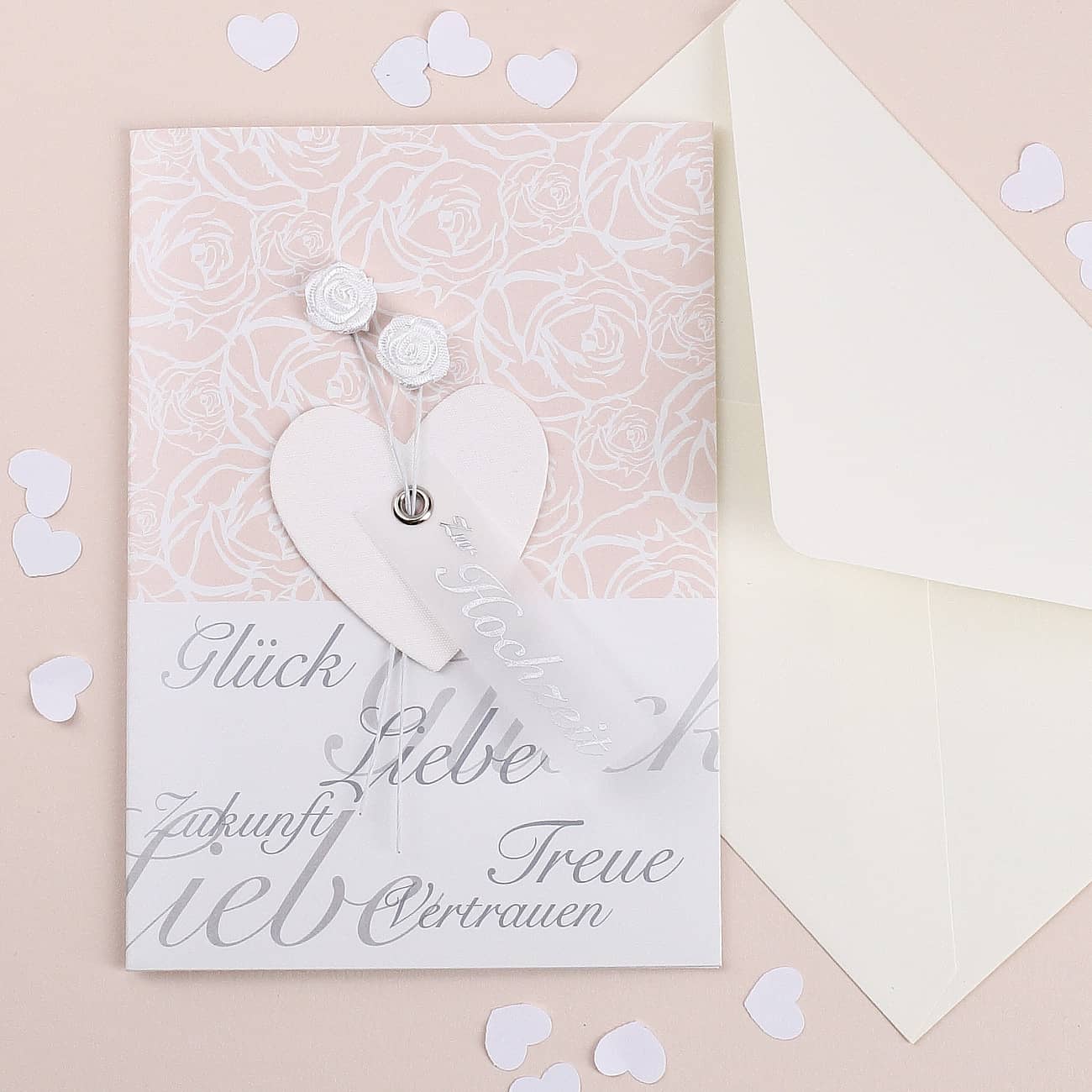 Die weiß-rosafarbene Karte mit zarten Rosenornamenten wird mittig von einem Herz- und Rosenanhänger verziert, auf dem das Bändchen mit der Aufschrift „Zur Hochzeit“ festgemacht ist.