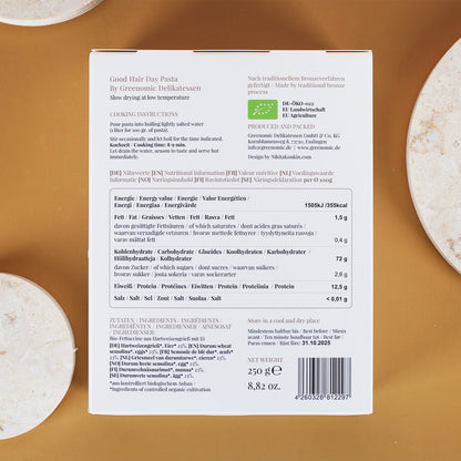 Entdecken Sie unsere unwiderstehlichen Good Hair Day Pasta! Diese köstlichen Fettuccine sind nicht nur ein Fest für Ihren Gaumen, sondern auch ein Augenschmaus dank ihrer raffinierten Verpackung. Jede Packung enthält 250 g Bio-Fettuccine, hergestellt aus feinstem Hartweizengrieß und Ei, für einen authentischen Geschmack und eine perfekte Konsistenz. Was diese Pasta so besonders macht, ist die einzigartige Verpackung. Durch eine transparente Stelle in der Verpackung entsteht das Bild einer Frau mit wunderschönem Haar aus Fettuccine - ein originelles und ansprechendes Design, das diese Pasta zu einem tollen Geschenk für Genießer macht.