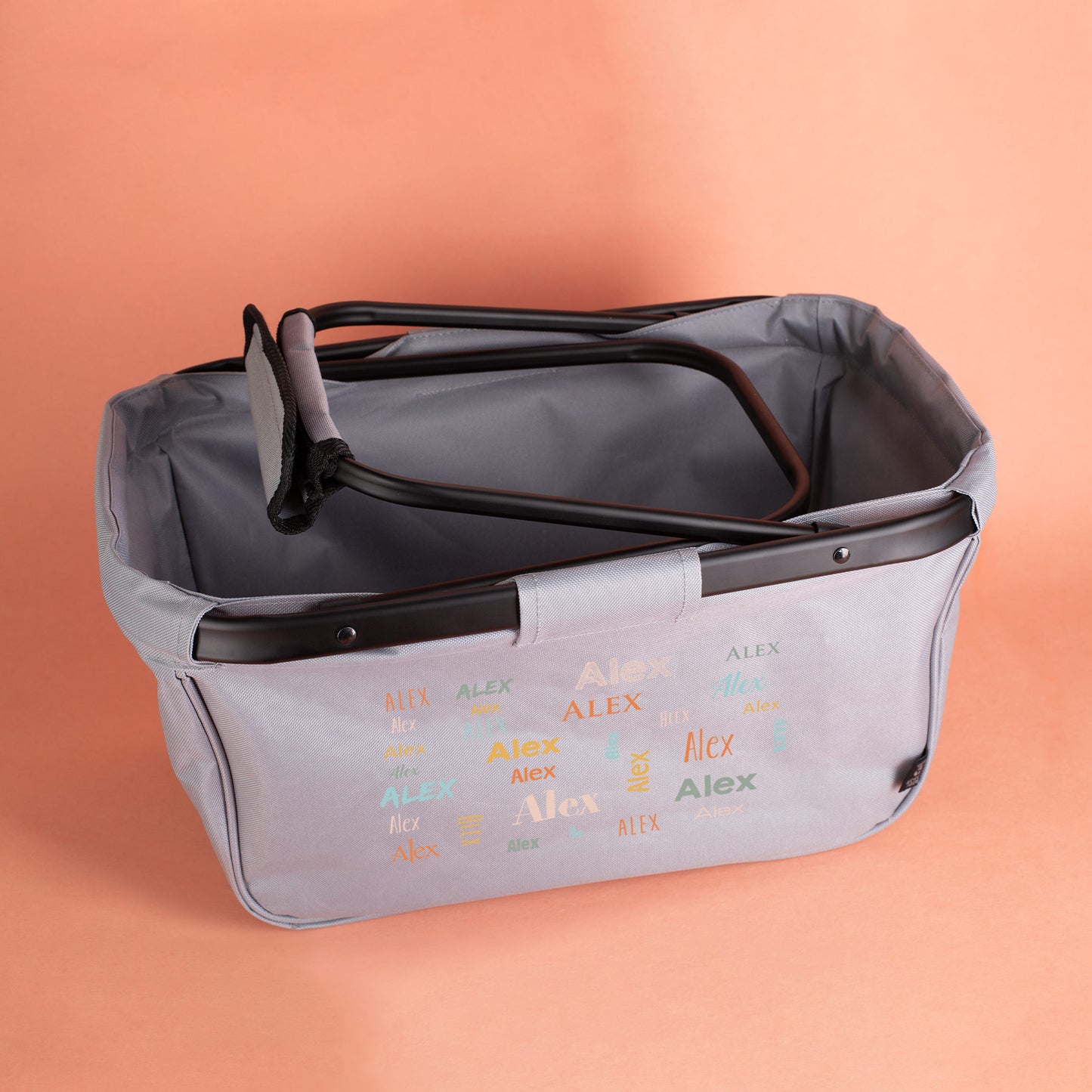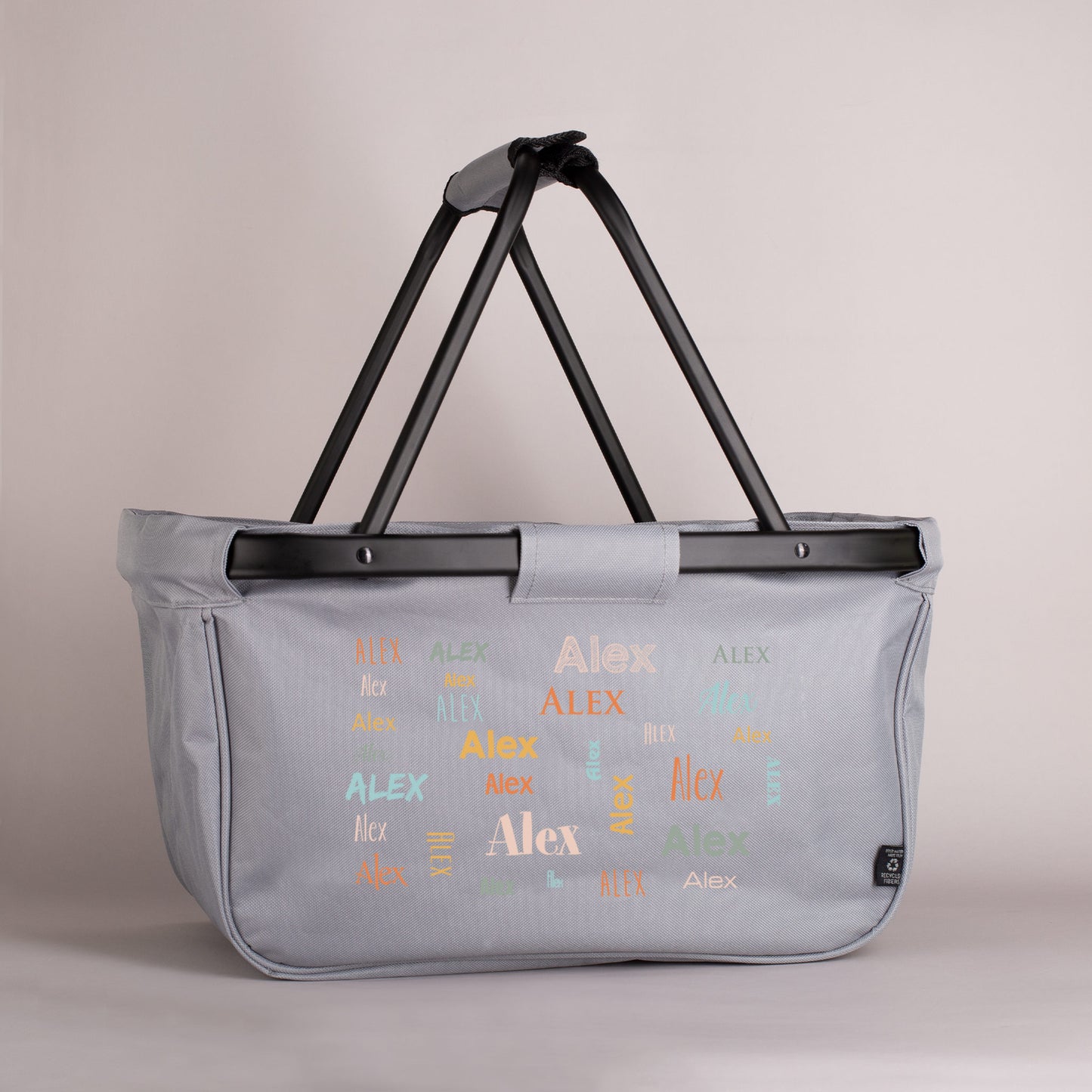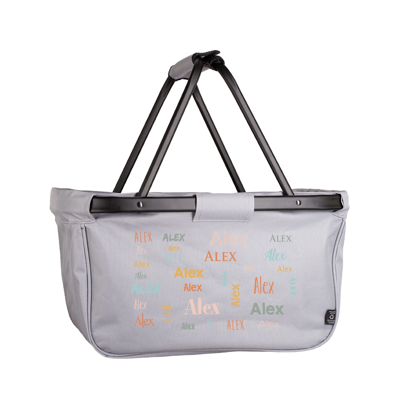Grauer Einkaufskorb mit Ihrem Wunschnamen in verschiedenen Farben