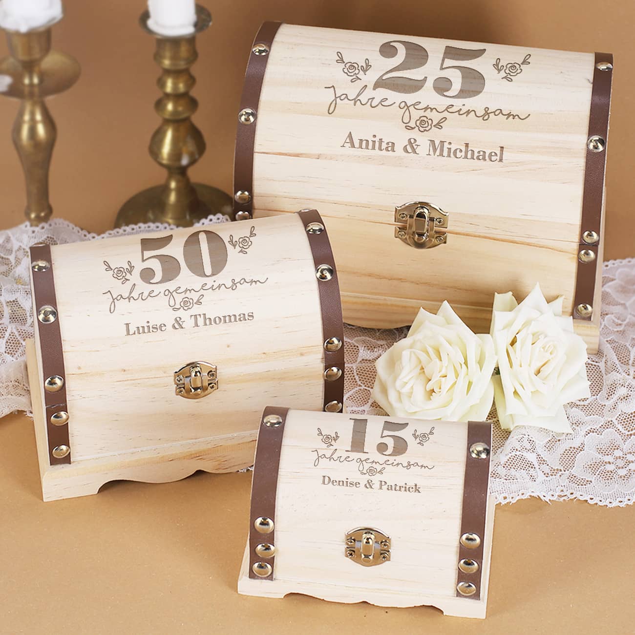 Ob zum ersten, zehnten oder fünfzigsten Hochzeitstag – die gravierte Schatztruhe passt sich jedem Jubiläum an. Dank der Möglichkeit, die Jahreszahl und die Namen des Paares zu personalisieren, wird sie zu einem ganz besonderen Erinnerungsstück. Nach dem Entnehmen der Geschenke kann die Truhe zur Aufbewahrung wertvoller Gegenstände und Erinnerungen verwendet werden. Mit dieser personalisierten Schatztruhe verleihen Sie Ihrem Geschenk eine besondere Note und schaffen eine bleibende Erinnerung an den Hochzeitstag des Paares. Egal ob Sie Geld, Gutscheine oder andere kleine Präsente verschenken möchten – diese Truhe ist die perfekte Wahl für ein stilvolles und persönliches Geschenk.