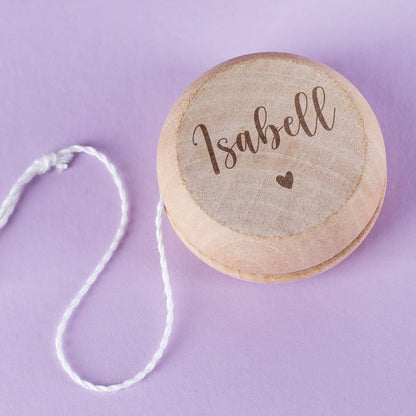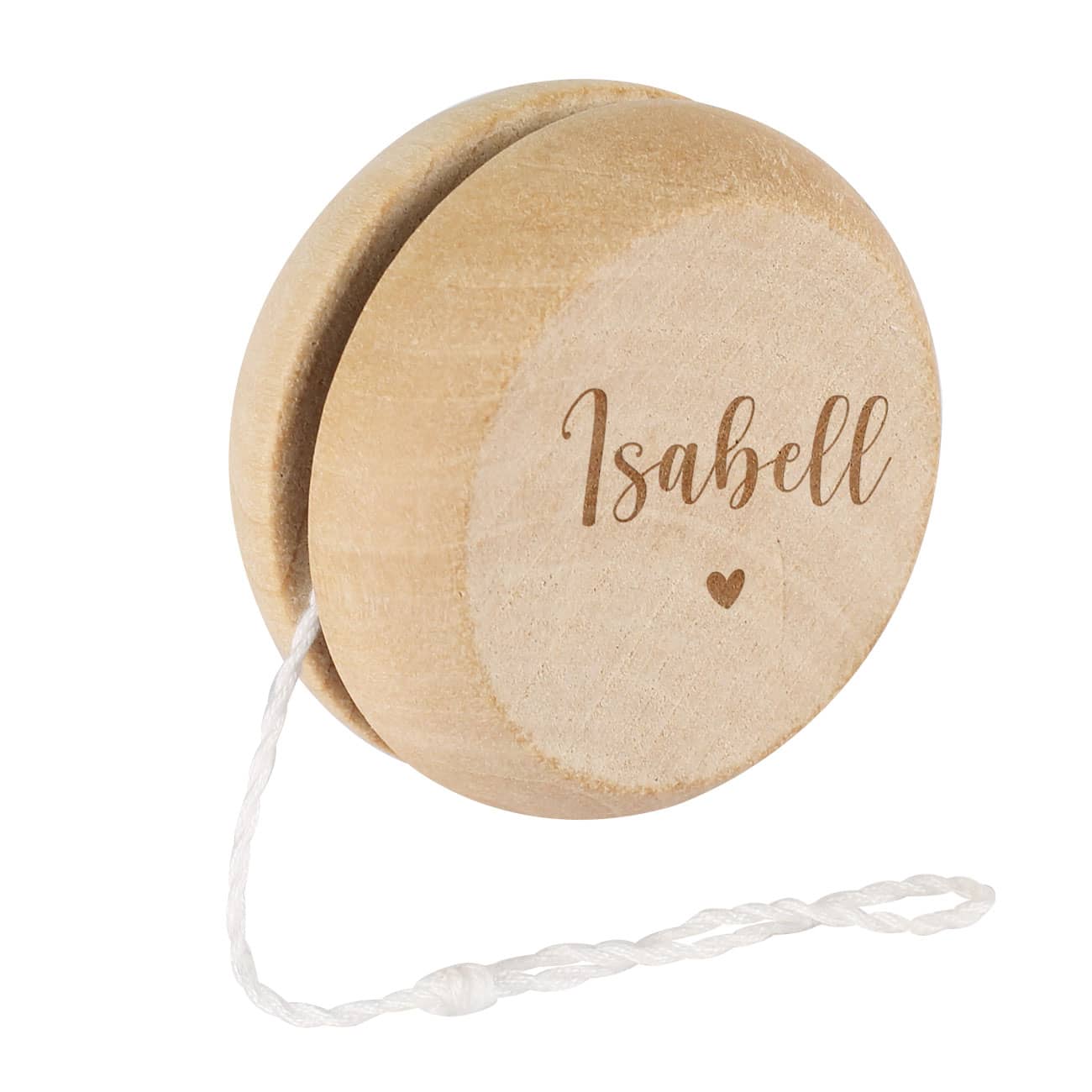 Entdecken Sie unser wunderschönes, graviertes Jojo aus Holz, personalisiert mit Name und Herz. Die Namensgravur wird in einer eleganten, geschwungenen Schrift abgebildet, ergänzt durch ein kleines Herz, was für eine besonders ansprechende Optik sorgt. Dieses Jojo ist ein tolles Geschenk für Kinder und Erwachsene, die sich ihre kindliche Freude bewahrt haben. Dieses personalisierte Spielzeug eignet sich perfekt für Geburtstage, Muttertag, Ostern, Nikolaus und viele andere Anlässe.