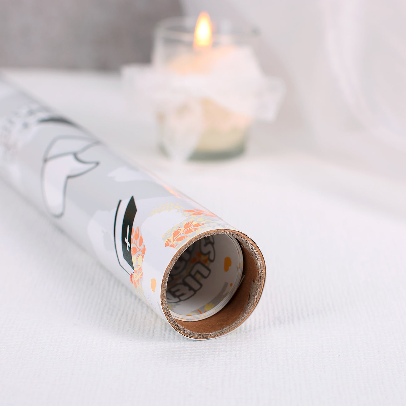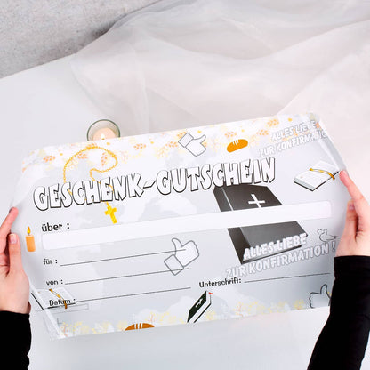 Zur Konfirmation werden jugendliche Christen in die Gemeinschaft der Erwachsenen aufgenommen. Zu diesem besonderen Anlass haben wir ein besonderen Geschenkgutschein. Schenken Sie dem Konfirmanden diesen persönlichen Gutschein im XXL Format. Der Gutschein steckt in einer Rolle, welche passend zum Thema gestaltet wurde. Alles Gute zur Konfirmation! steht auf der Außenseite der Gutschein-Geschenkverpackung. Der Gutschein ist 30 cm x 50 cm groß und bietet Platz um den Wert, den Namen des Konfirmanden und Ihren Namen darauf zu schreiben. Das Papier des Gutscheins ist beschichtet und lässt sich am besten mit einem wasserfesten Stift beschriften.