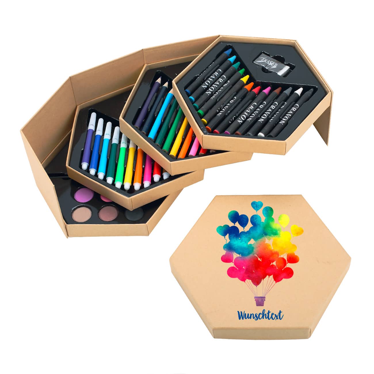 Großer Malkasten mit verschiedenen Stiften - bedruckt mit Wunschtext und Watercolormotiv