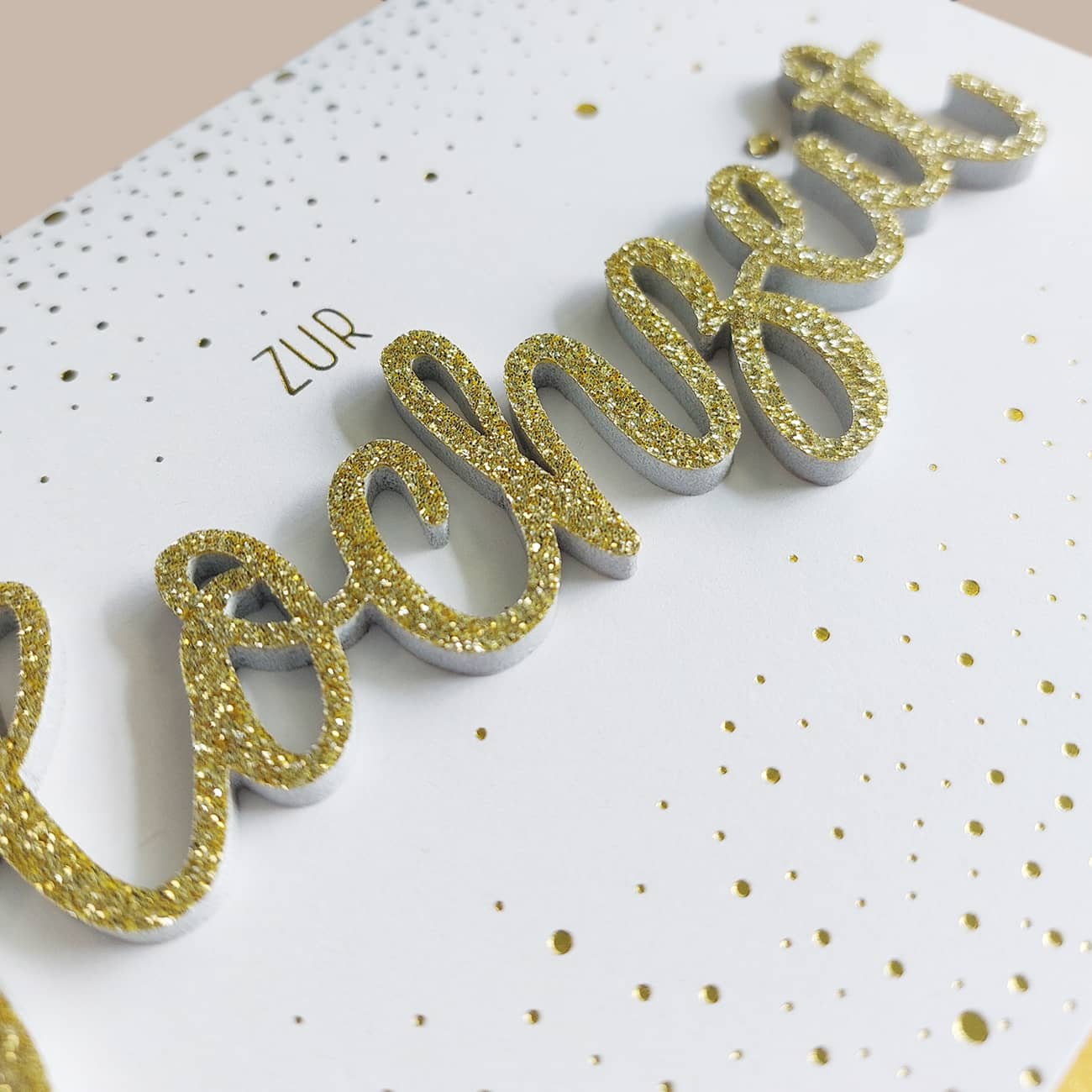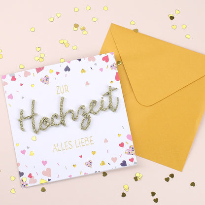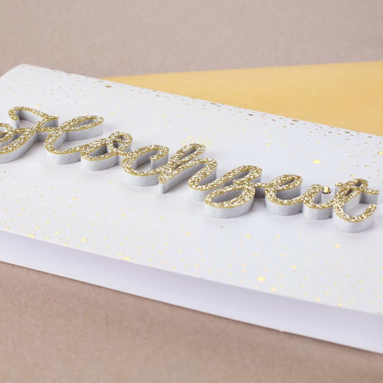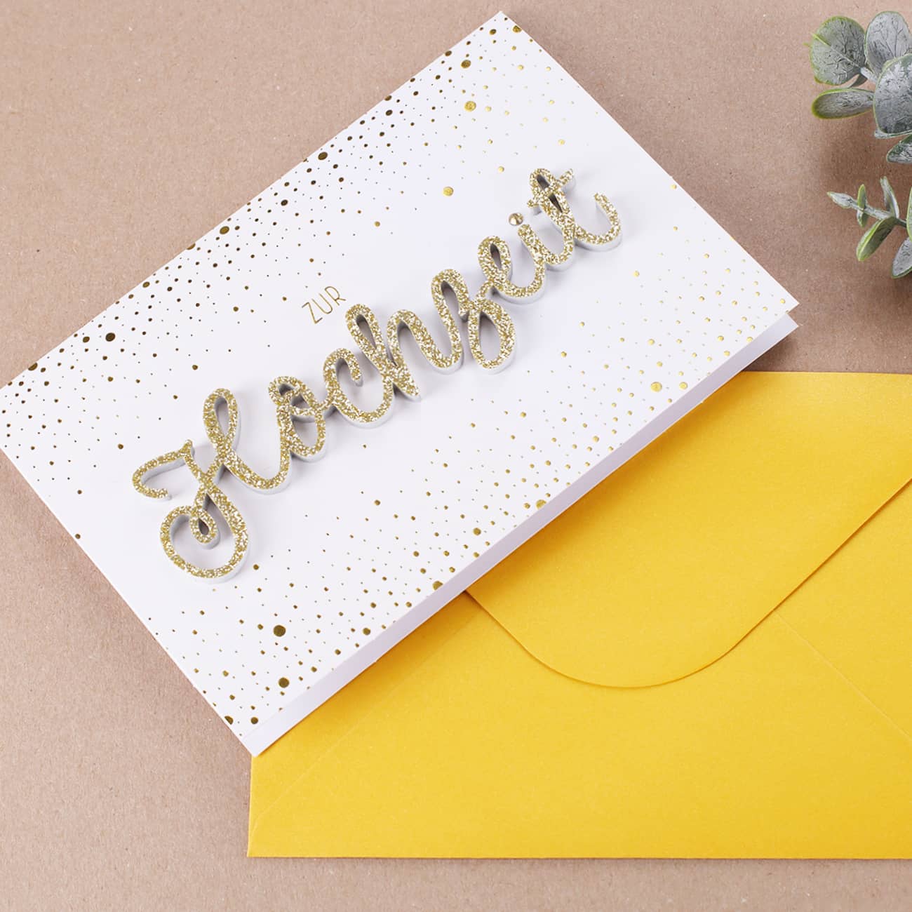 Eine Hochzeitskarte, die das Herz erwärmt! Inmitten von goldenen Punkten ragt dreidimensional und gold-funkelnd das Wort „Hochzeit“ auf der Karte hervor.