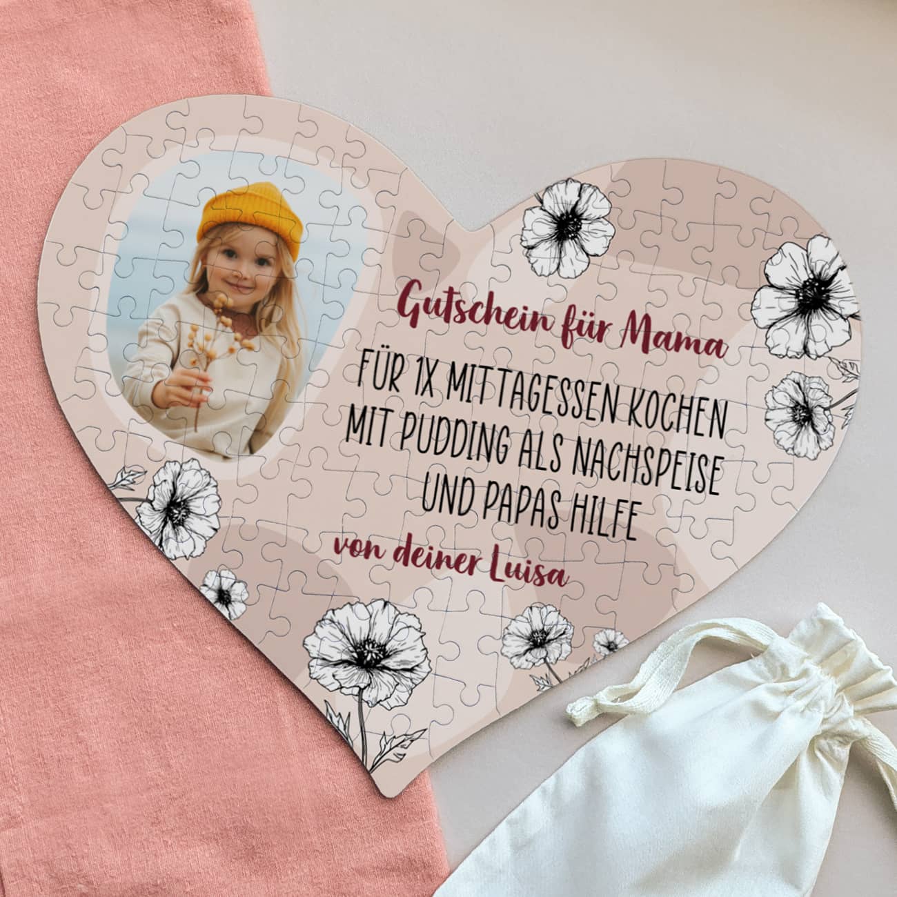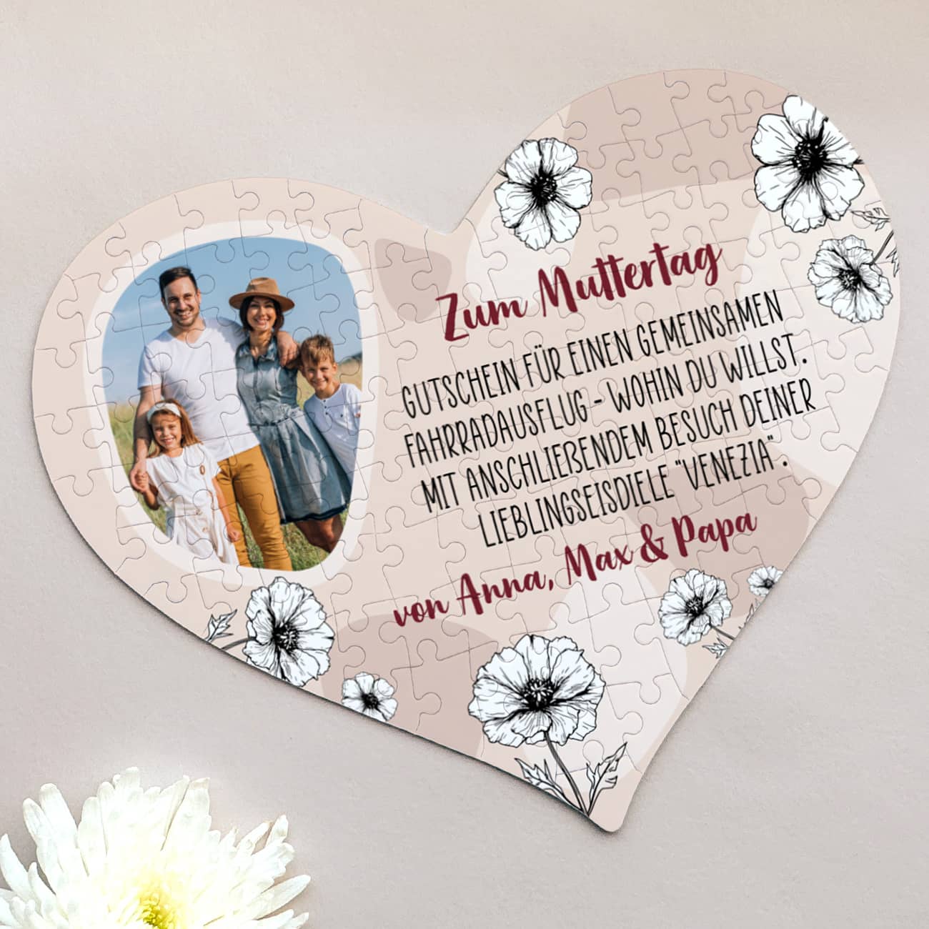 Gutschein-Puzzle in Herzform mit Blumen, Foto & Ihrem Wunschtext, 114 Teile