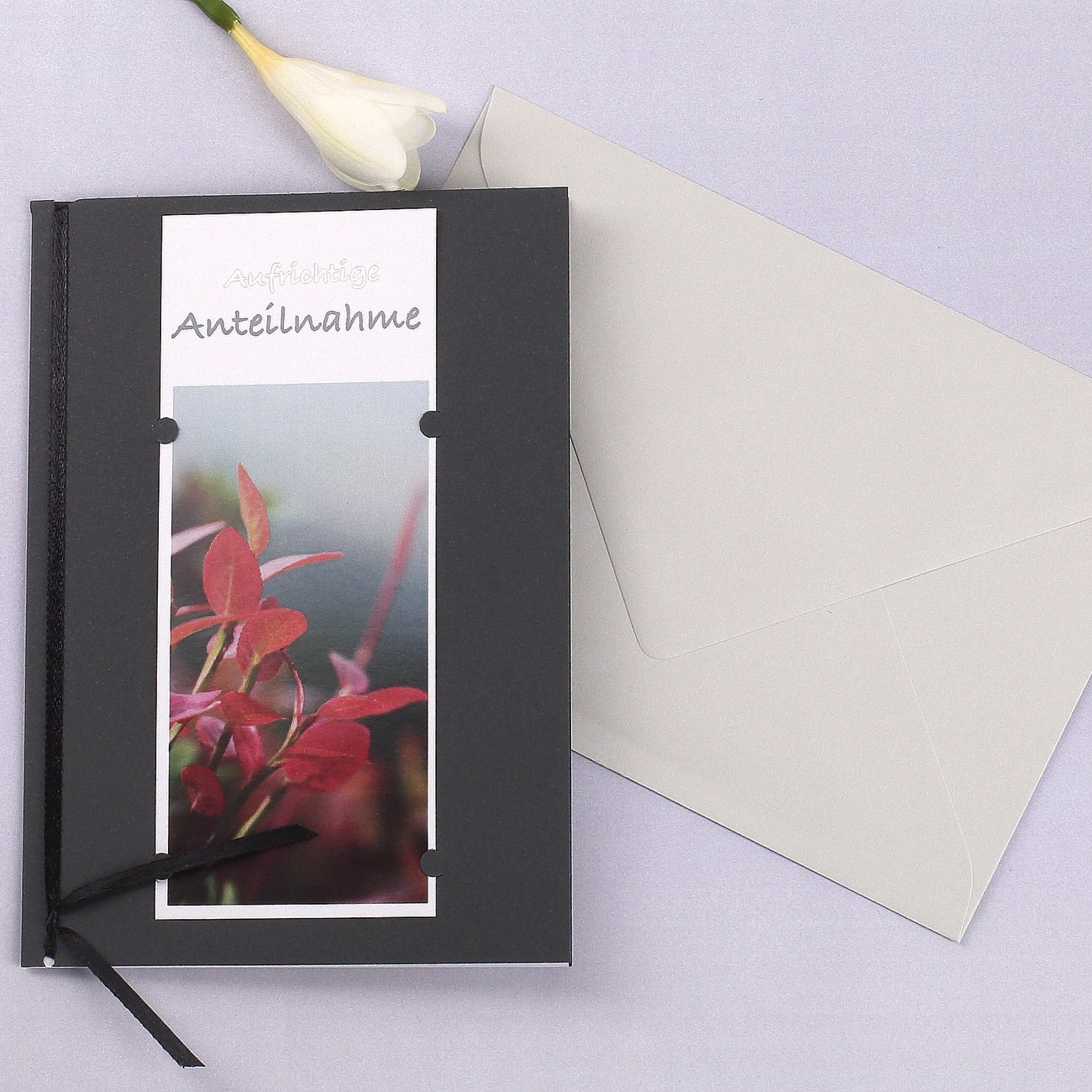 Diese schlichte Trauerkarte mit den Worten „Aufrichtige Anteilnahme“ hat eine Fotografie als Motiv und kann mit eigenen Worten auf der Innenseite ergänzt werden.