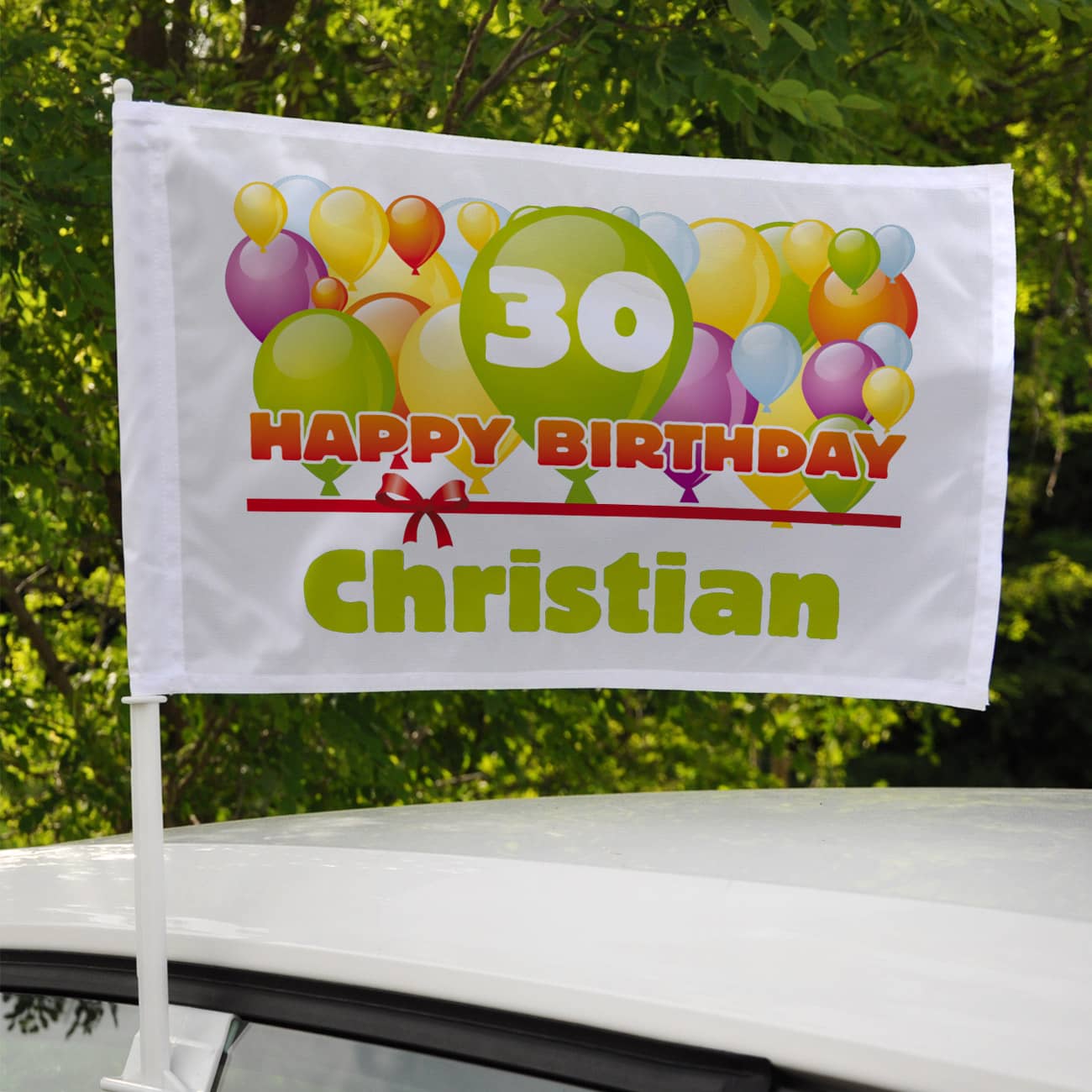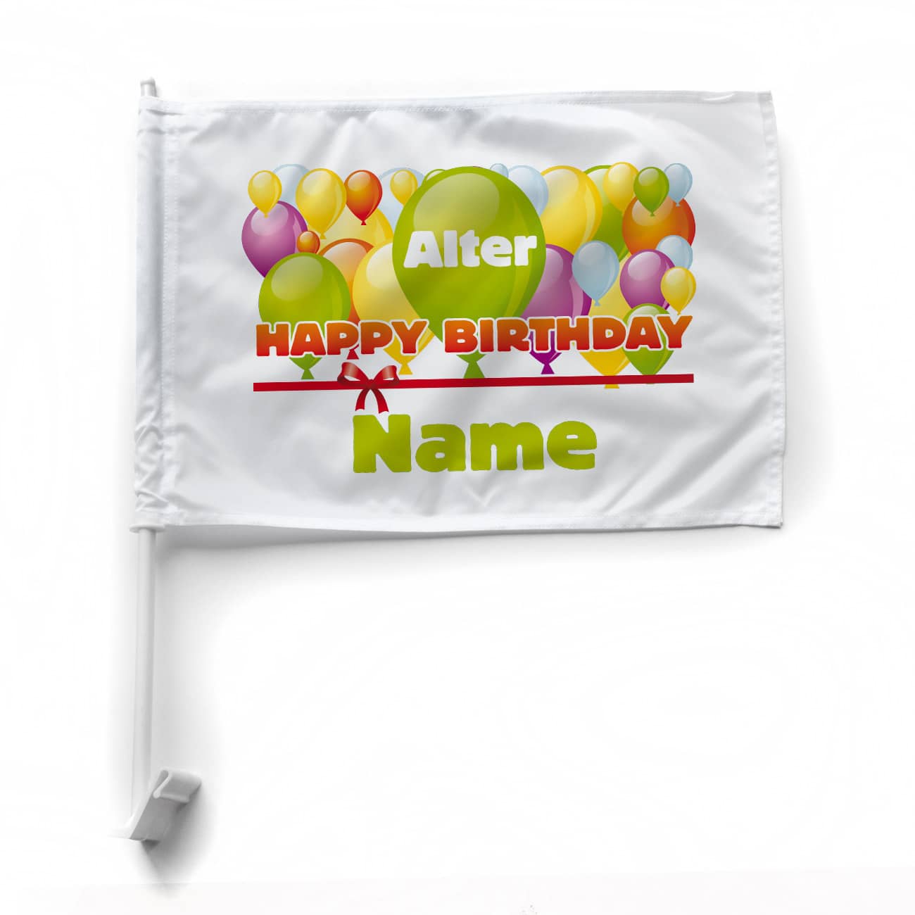 Happy Birthday Autofahne mit Name, Alter und bunten Luftballons