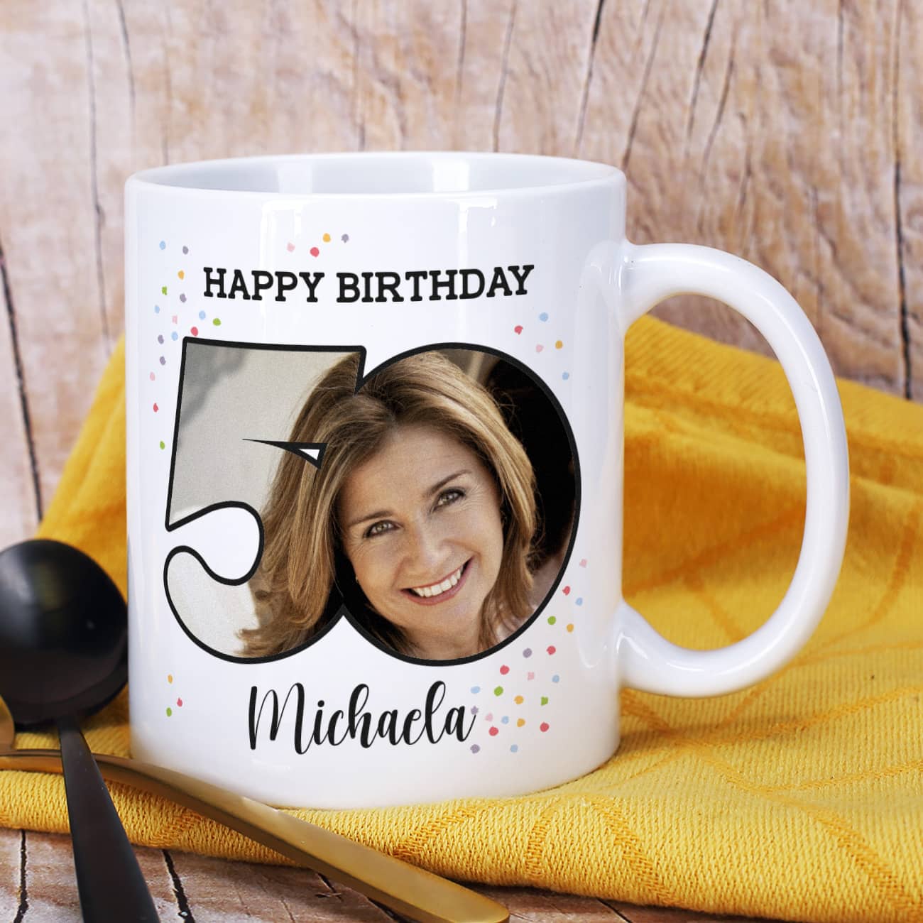 Der 50. Geburtstag markiert ein halbes Jahrhundert - dennoch ist man noch lange nicht alt! Feiern Sie mit einer geliebten Person den 50. Geburtstag mit dieser einmaligen Fototasse. Bedruckt wird Sie mit einem Foto Ihrer Wahl, welches in der 50 platziert wird. Hinzu kommt noch der Schriftzug "Happy Birthday" und der Name des Geburtstagskindes. Überreichen Sie diese tolle Geburtstagstasse direkt zum Frühstück, damit dieser besondere Tag erfolgreich starten kann. Fotogeschenke und personalisierte Geschenke werden jeden überraschen können, sei es jemand aus der Familie, ein Freund oder eine Freundin oder sogar jemand von der Arbeit, die oder den Sie besonders mögen. Ein Geburtstagsgeschenk wie dieses wird jedem augenblicklich ein Lächeln in das Gesicht zaubern.