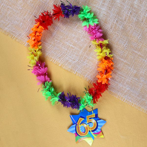 Peppen Sie das 65-jährige Geburtstagskind mit dieser bunten Hawaiikette auf! Versehen mit einer 65 ist der Sternanhänger eine schöne Erinnerung an das freudige Fest.