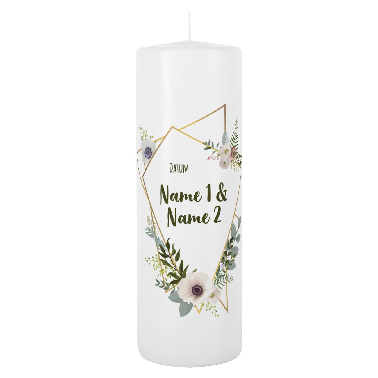 Aquarellblumen und Blätter in Kombination mit grafischen Elementen bilden bei dieser Hochzeitskerze das Hintergrundmotiv. Im Mittelpunkt stehen die Namen des Paares sowie das Datum der Trauung. Umseitig ist Platz für den Trauspruch oder einem anderen kurzen Text zum Thema Liebe.