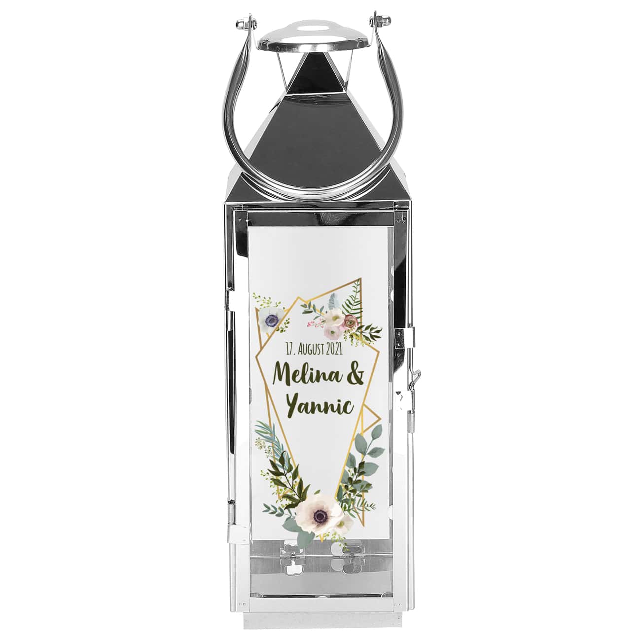 Dieses silberne Windlicht ist ein echtes Highlight-Geschenk zur Hochzeit und erinnert bei jedem Entzünden an den schönsten Tag im Leben. Aquarellblumen und Blätter in Kombination mit grafischen Elementen werden bei dieser romantischen Laterne von den Namen des Brautpaares sowie dem Datum der Trauung ergänzt. Der persönliche Aufdruck befindet sich an der Innenseite der Glastür und kommt besonders schön zur Geltung, wenn die Laterne mit einer hellen Kerze bestückt wird. Und für alle, de es etwas dezenter mögen, haben wir auch eine romantische Hochzeitslaterne mit Gravur im Angebot.