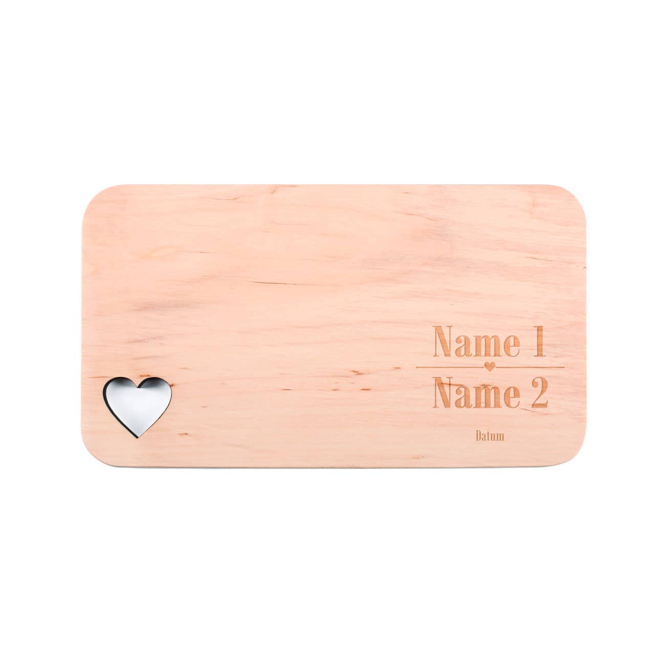 Dieses Holzbrettchen ist nicht nur romantisch sondern auch praktisch. Das Brettchen aus Erlenholz wird einseitig mit den Vornamen des Paares und einem Datum graviert. Eine zusätzliche Linie und ein kleines Herz zwischen den Namen vollendet das Motiv. Sie können das Hochzeitsdatum, das Kennenlerndatum oder irgendein anderes Datum angeben.