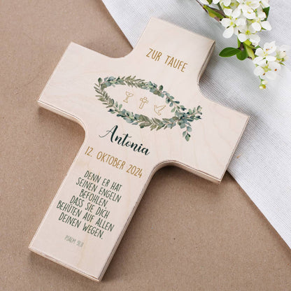 Holzkreuz mit Eukalyptus Fisch - zur Taufe, Kommunion oder Konfirmation