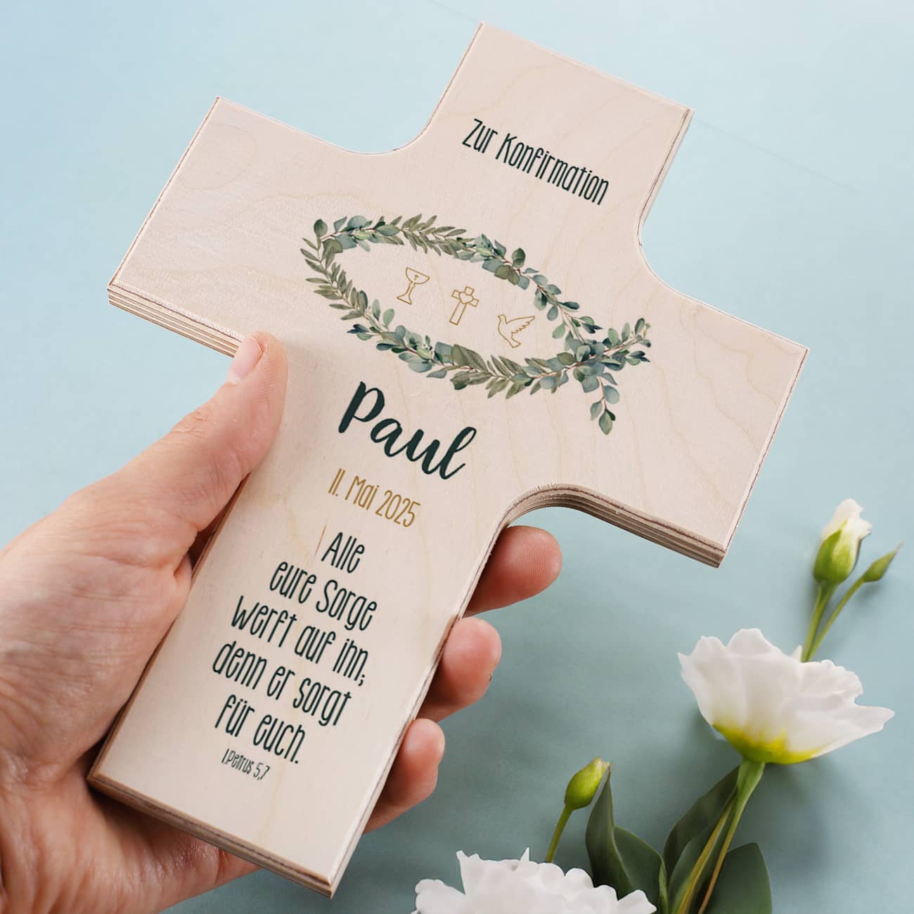 Dank der einfachen Konfiguration ist es möglich, das Kreuz nach Ihren Wünschen anzupassen, sodass es eine persönliche und bleibende Erinnerung darstellt. Es eignet sich hervorragend, um an einem besonderen Ort im Haus aufgehängt zu werden, wo es als tägliche Erinnerung an diesen wichtigen Glaubensschritt dient. Die Personalisierung und das Design machen dieses Kreuz zur perfekten Wahl für besondere Anlässe wie die Taufe, Kommunion oder Konfirmation. Das edle Eukalyptusmotiv verleiht dem Kreuz eine moderne und zugleich zeitlose Optik, die sich harmonisch in jede Umgebung einfügt.