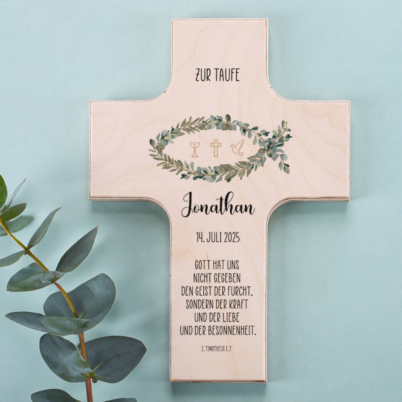 Dieses stilvolle Holzkreuz zur Taufe, Kommunion oder Konfirmation ist mehr als nur ein Dekorationselement – es ist ein tiefgründiges Symbol des Glaubens und eine wunderschöne Möglichkeit, die besonderen Momente im Leben eines Kindes zu feiern. Das Kreuz wird aus hochwertigem Ahornholz gefertigt und misst ca. 14 cm x 19 cm x 1,5 cm (B/H/T). Der einseitige Aufdruck zeigt ein elegantes Eukalyptusmotiv, das durch religiöse Symbole wie Kelch, Kreuz und Taube ergänzt wird. Das Kreuz lässt sich individuell mit dem Namen des Kindes, dem Datum des Ereignisses und einem Segenswunsch personalisieren, wodurch es zu einem einzigartigen und bedeutsamen Geschenk wird.