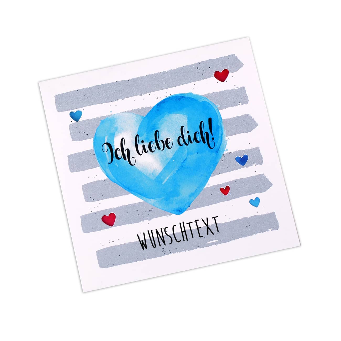 Eine kleine Liebesbotschaft vorzufinden, lässt die meisten Herzen höher schlagen. Sie versüßt den Tag und bringt romantische Augenblicke in die Beziehung. Dass es sich dabei nicht um teure Geschenke handeln muss, beweist diese schöne Klappkarte mit Herzen. Ein Blick auf die Karte genügt und schon weiß der oder die Beschenkte Bescheid: Ich liebe dich! ist auf einem blauen Herzen zu lesen. Darunter steht Ihnen eine Zeile für Ihren Wunschtext zur Verfügung. Das kann zum Beispiel der Name des Empfängers sein, oder ein kurzer Spruch aus maximal 30 Zeichen.